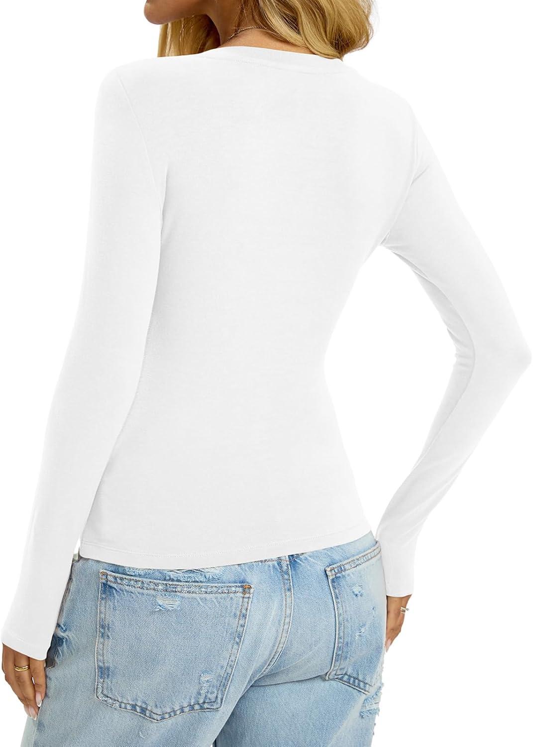 Womens Cotton Long Sleeve Shirts V Neck Slim Fit Tops Basic Tees Going Out Outfits 2025 Fall Spring(White)