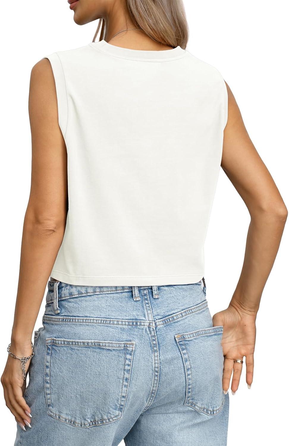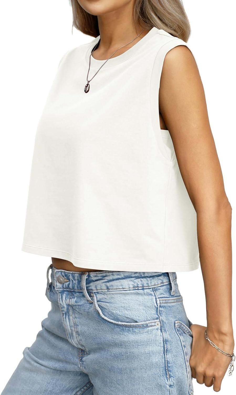 Womens Cotton Loose Fit Crop Tank Tops Basic Crewneck Sleeveless Tee Casual Workout Summer Going Out Outfits(White)