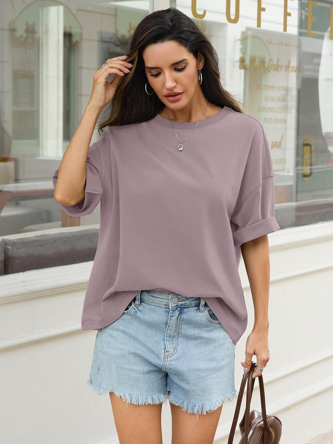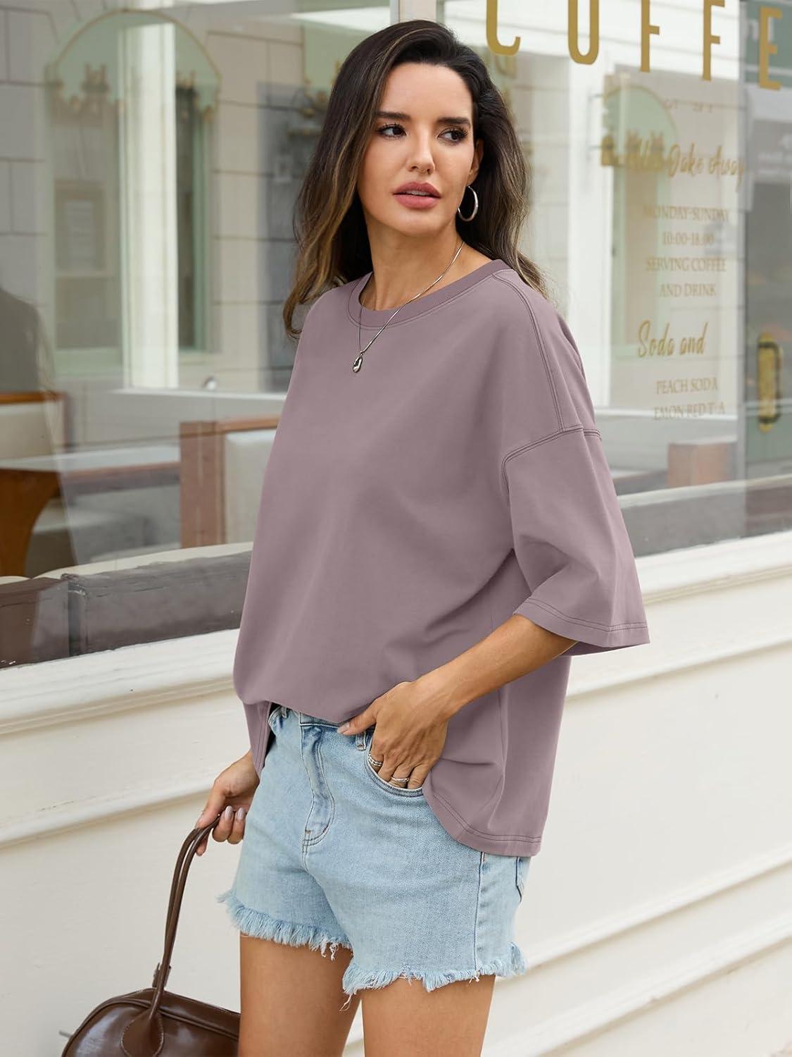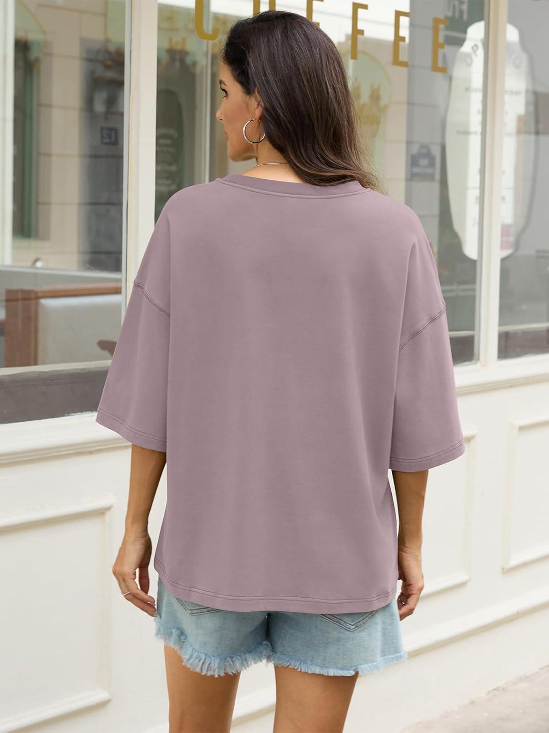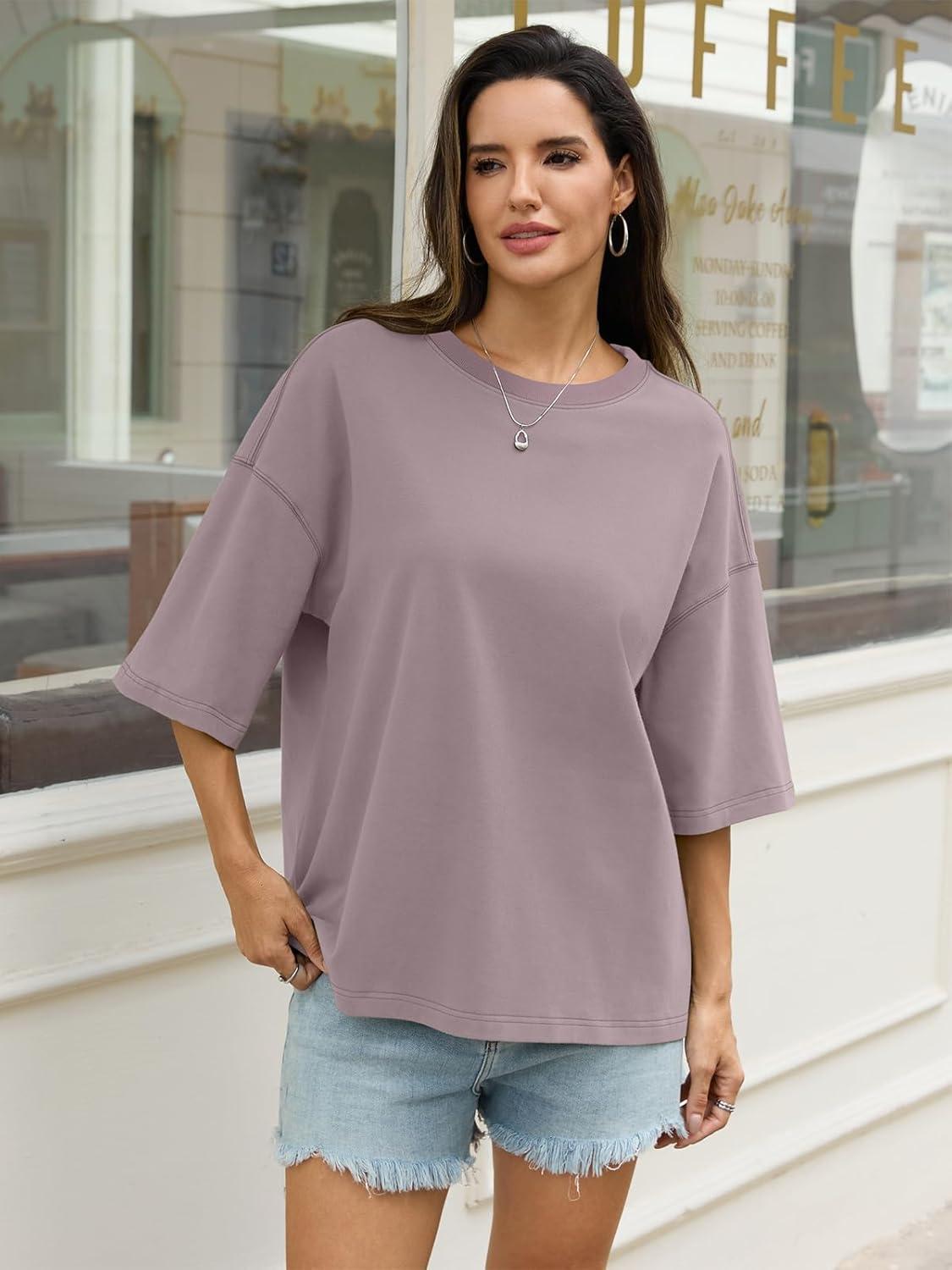 Womens Cotton Oversized T Shirts Drop Shoulder Half Sleeve Boxy Tops Crewneck Loose Fit Short Sleeves Tee 2026(Purple)