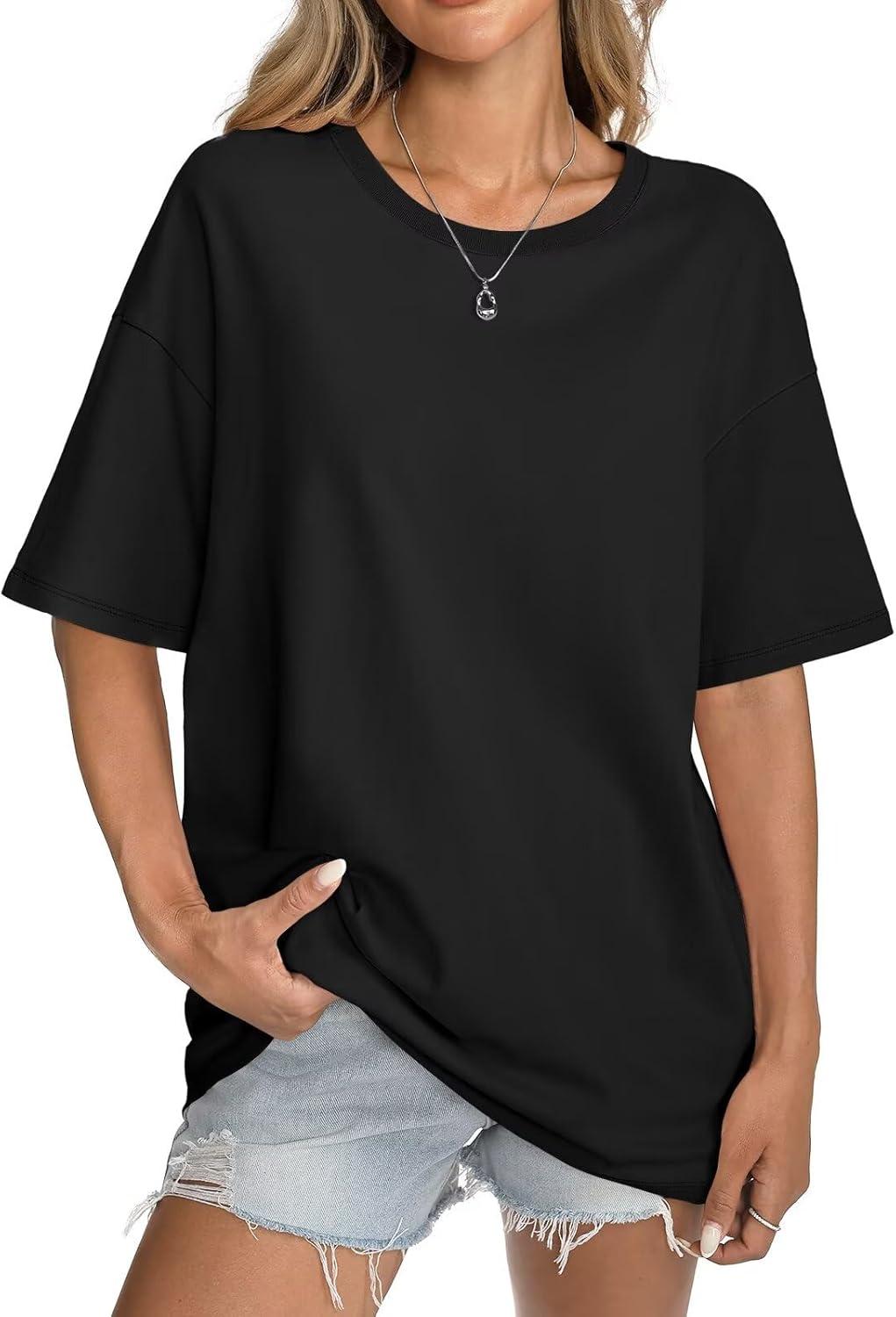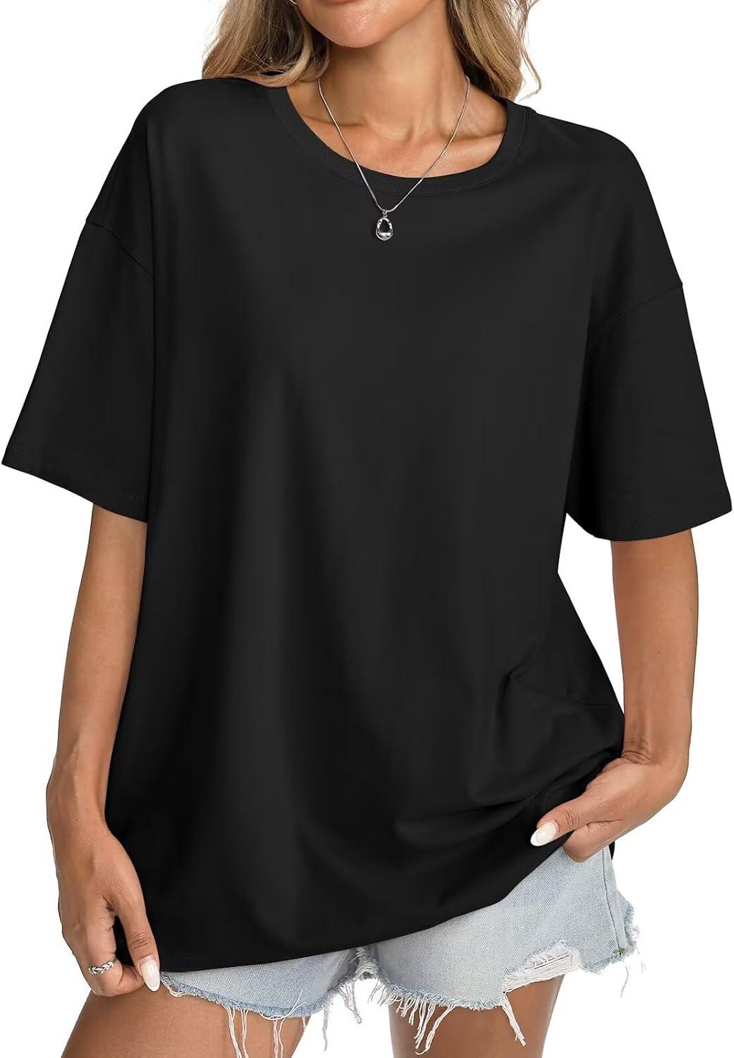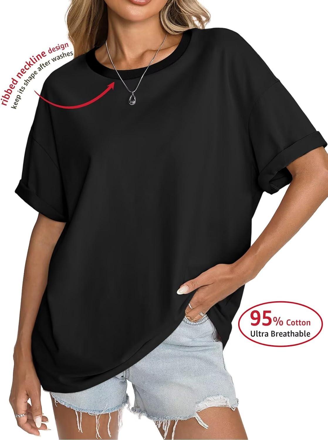 Womens Cotton Oversized T Shirts Short Sleeve Tops Ribbed Crewneck Loose Fit Tee Summer Fashion Clothes 2026(Black)