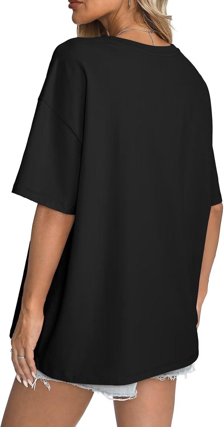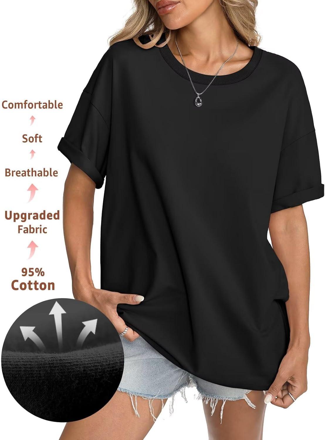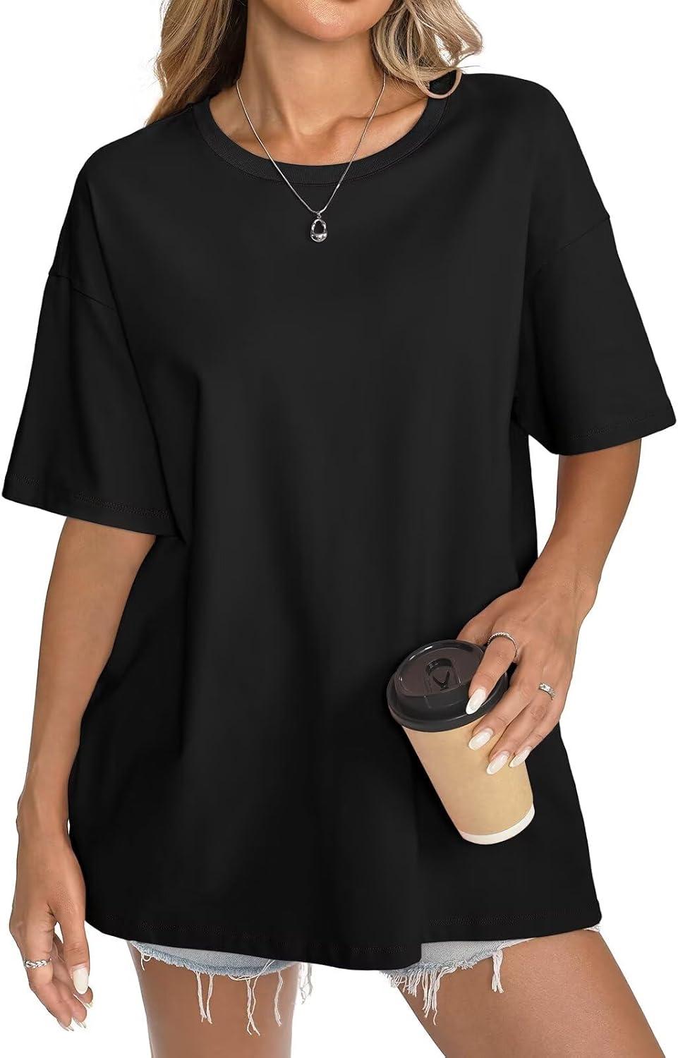 Womens Cotton Oversized T Shirts Short Sleeve Tops Ribbed Crewneck Loose Fit Tee Summer Fashion Clothes 2026(Black)