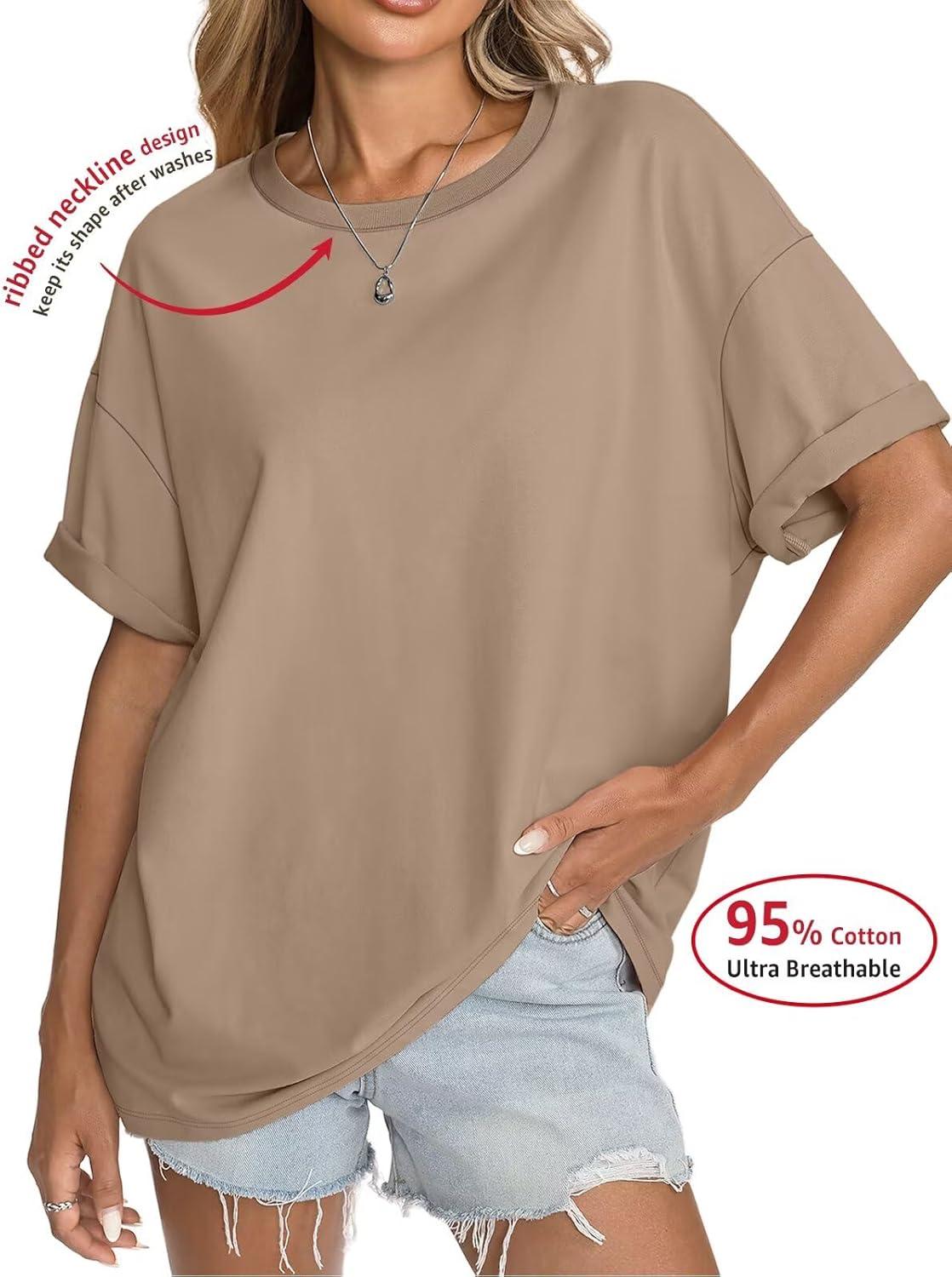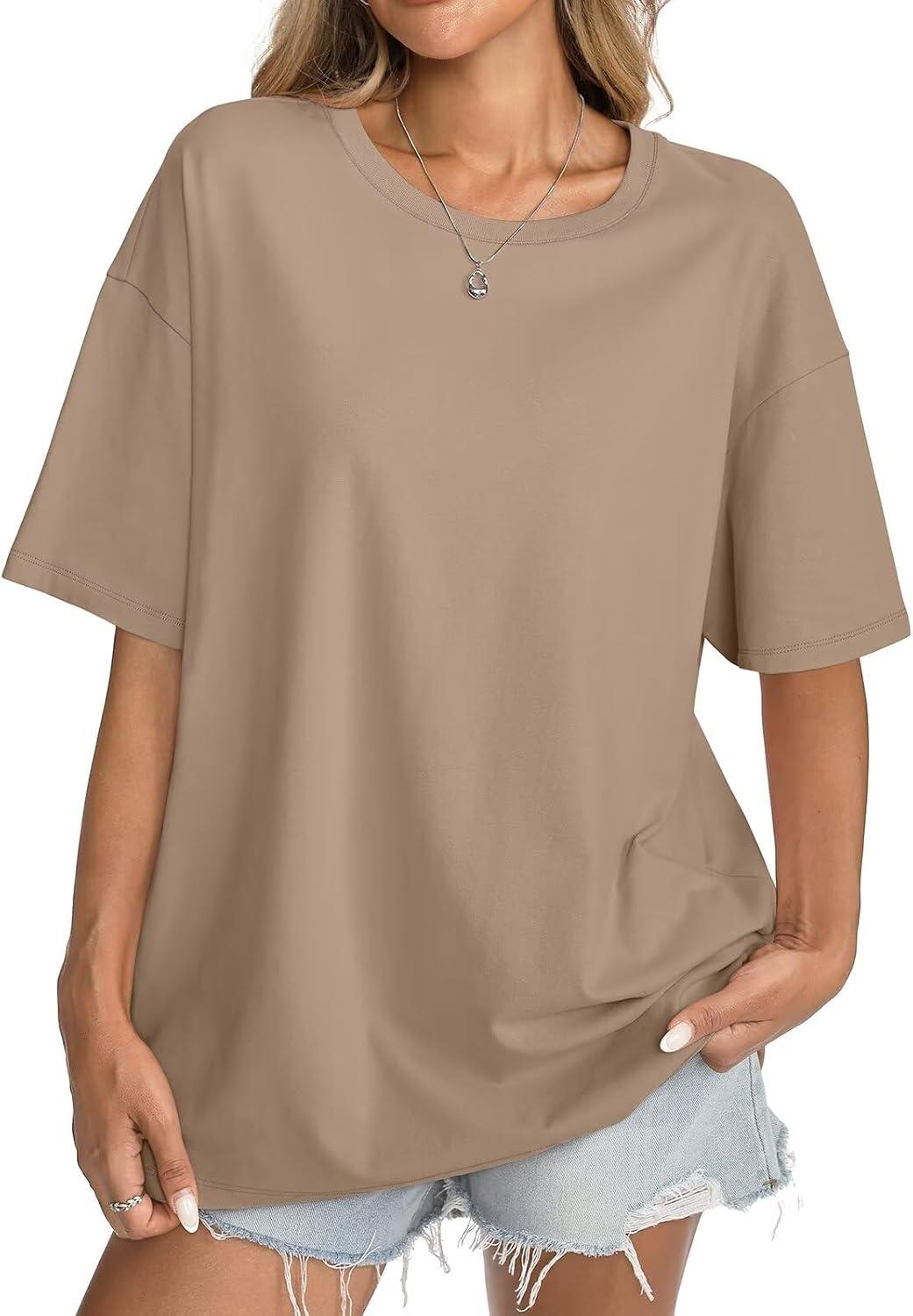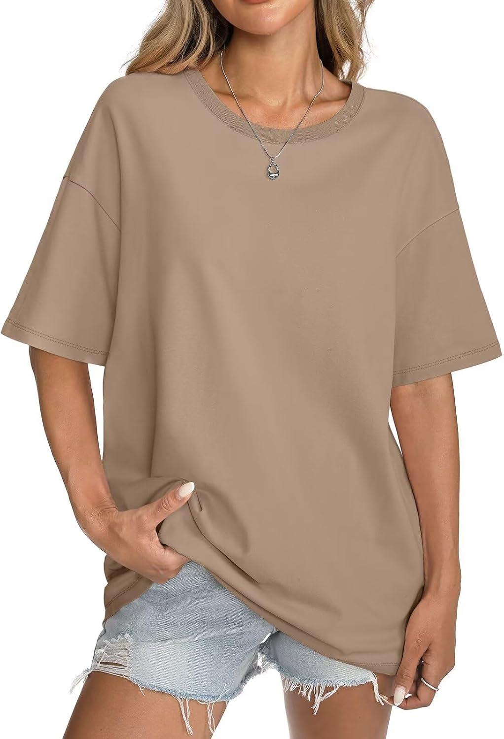 Womens Cotton Oversized T Shirts Short Sleeve Tops Ribbed Crewneck Loose Fit Tee Summer Fashion Clothes 2026(Khaki)