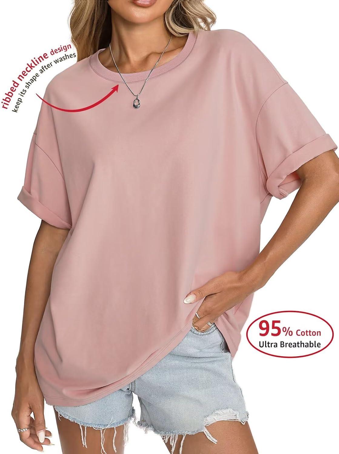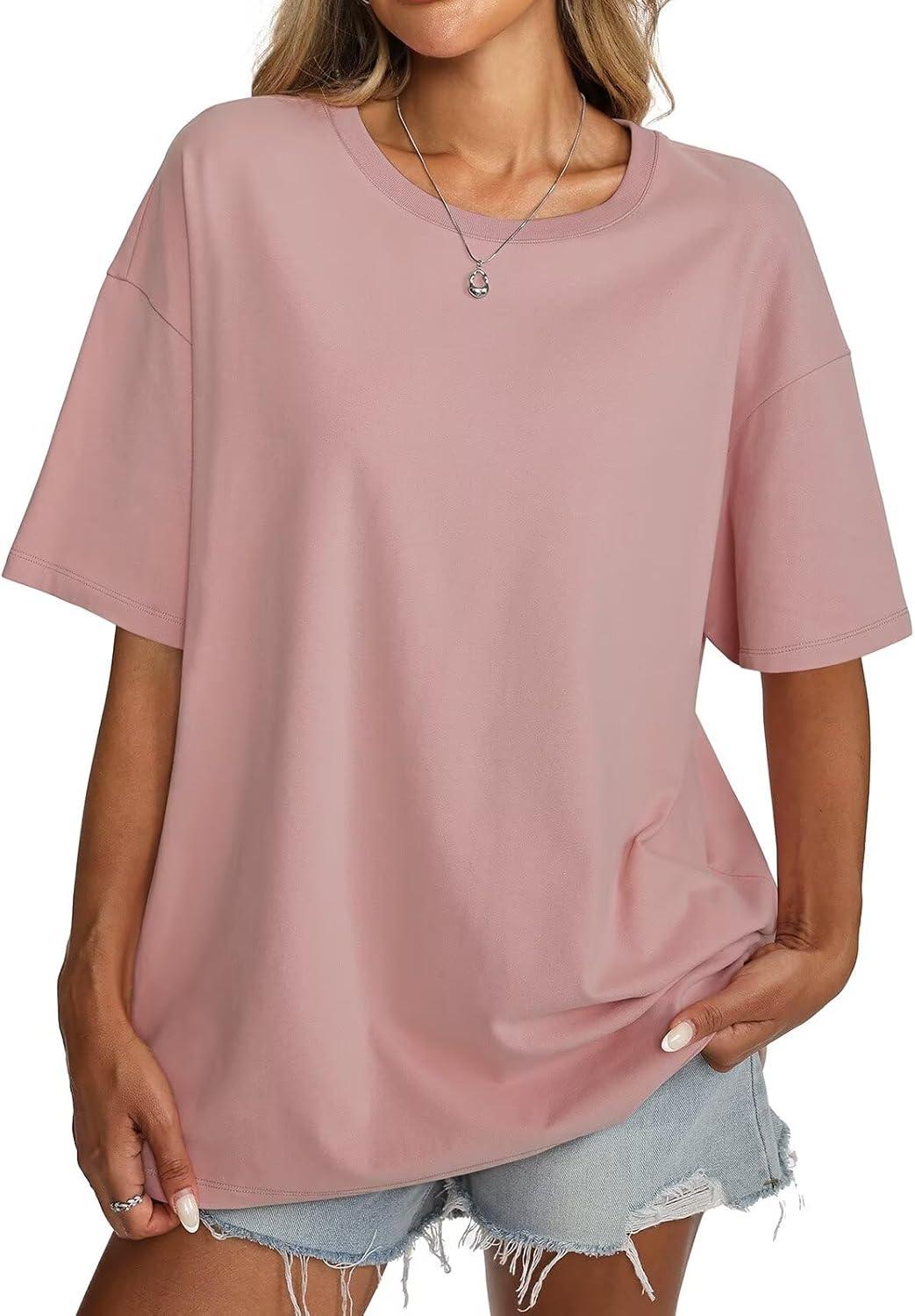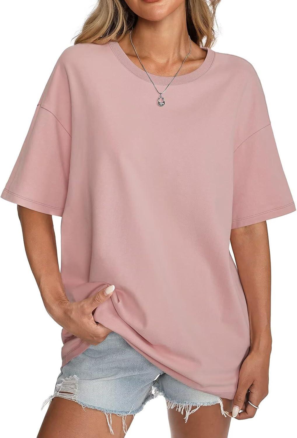 Womens Cotton Oversized T Shirts Short Sleeve Tops Ribbed Crewneck Loose Fit Tee Summer Fashion Clothes 2026(Pink)