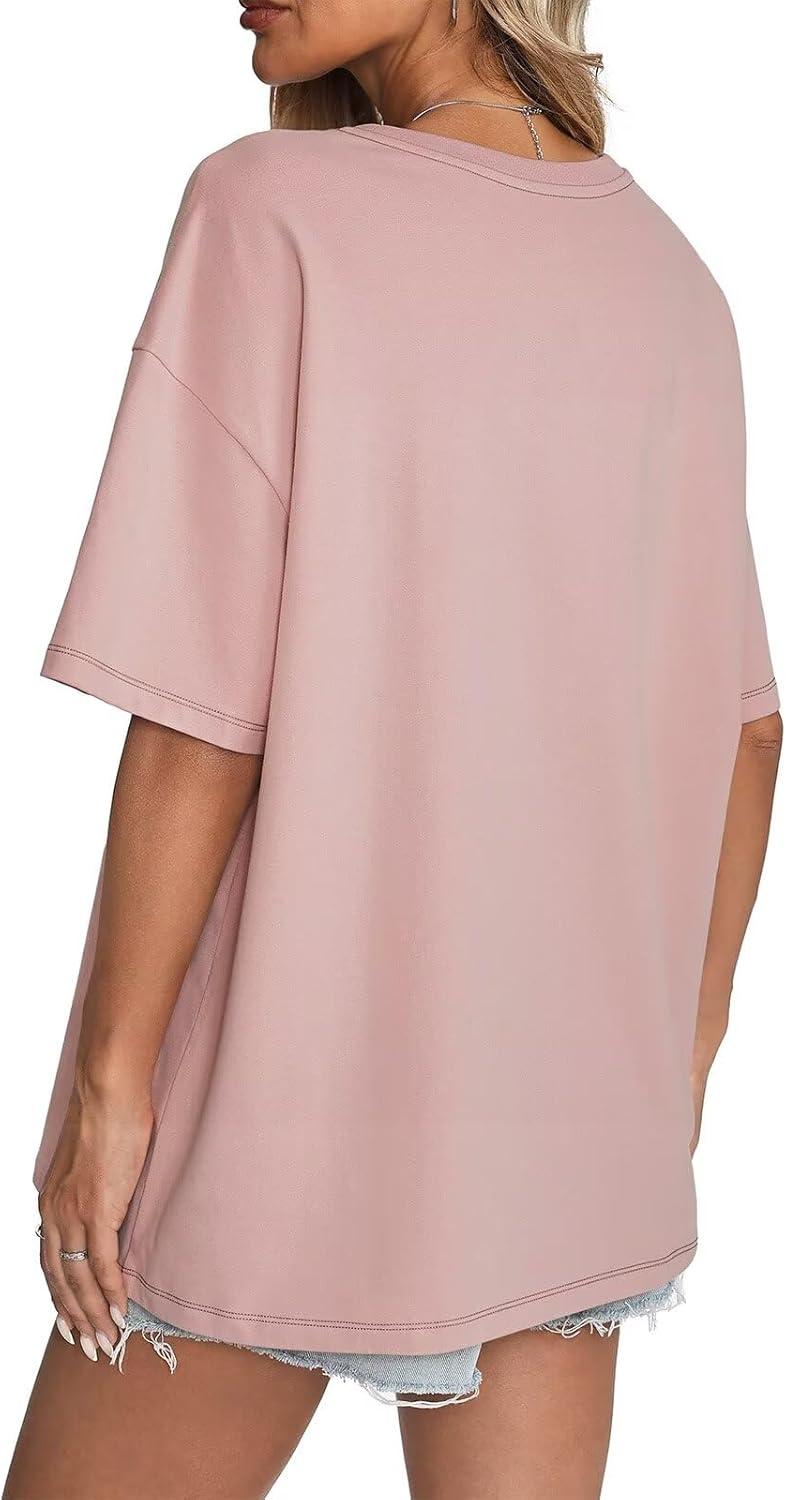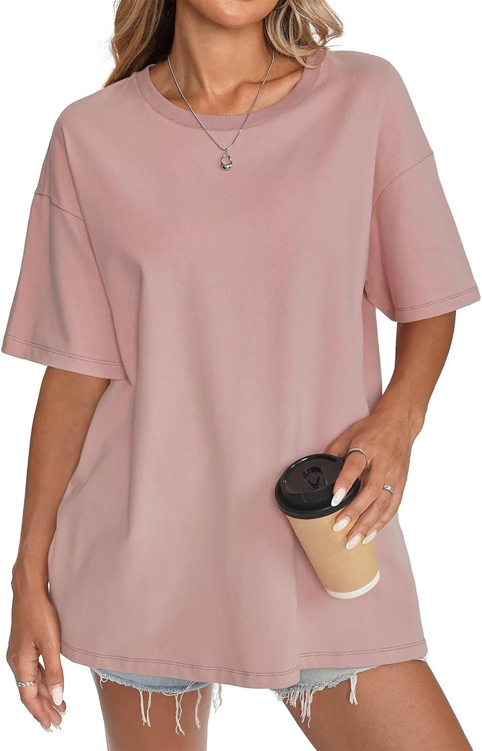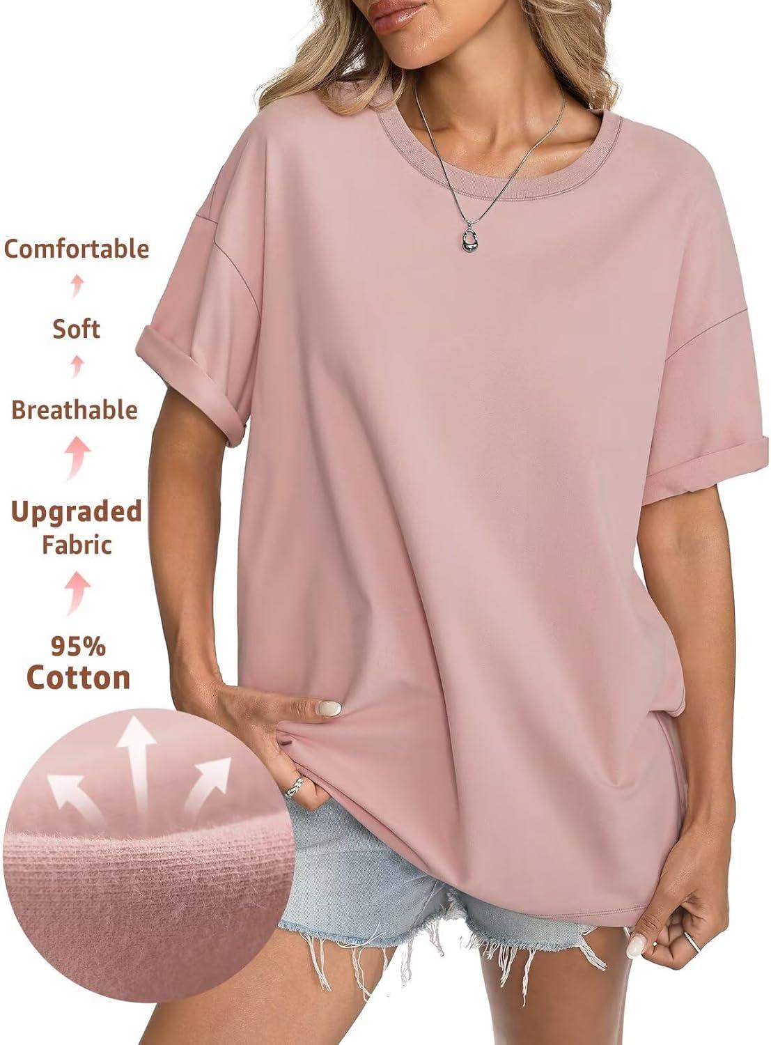 Womens Cotton Oversized T Shirts Short Sleeve Tops Ribbed Crewneck Loose Fit Tee Summer Fashion Clothes 2026(Pink)