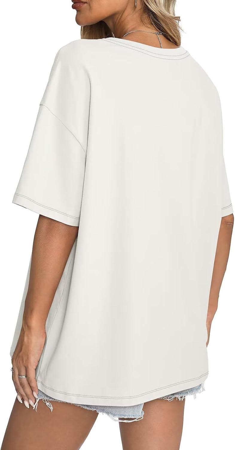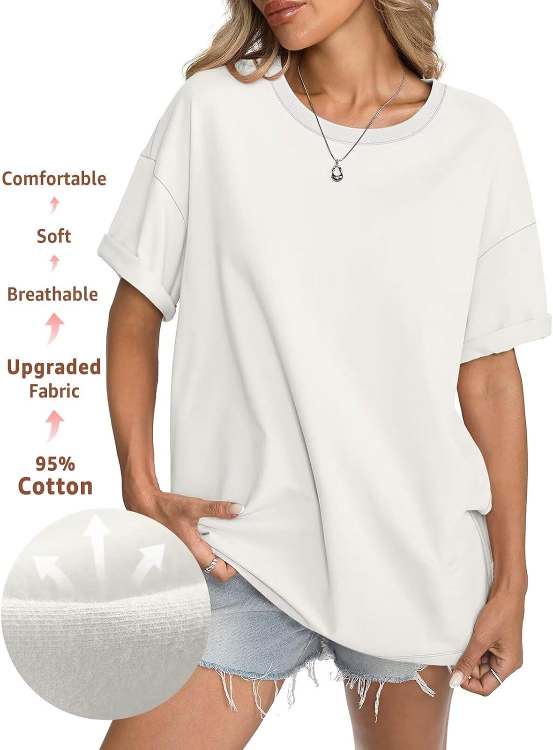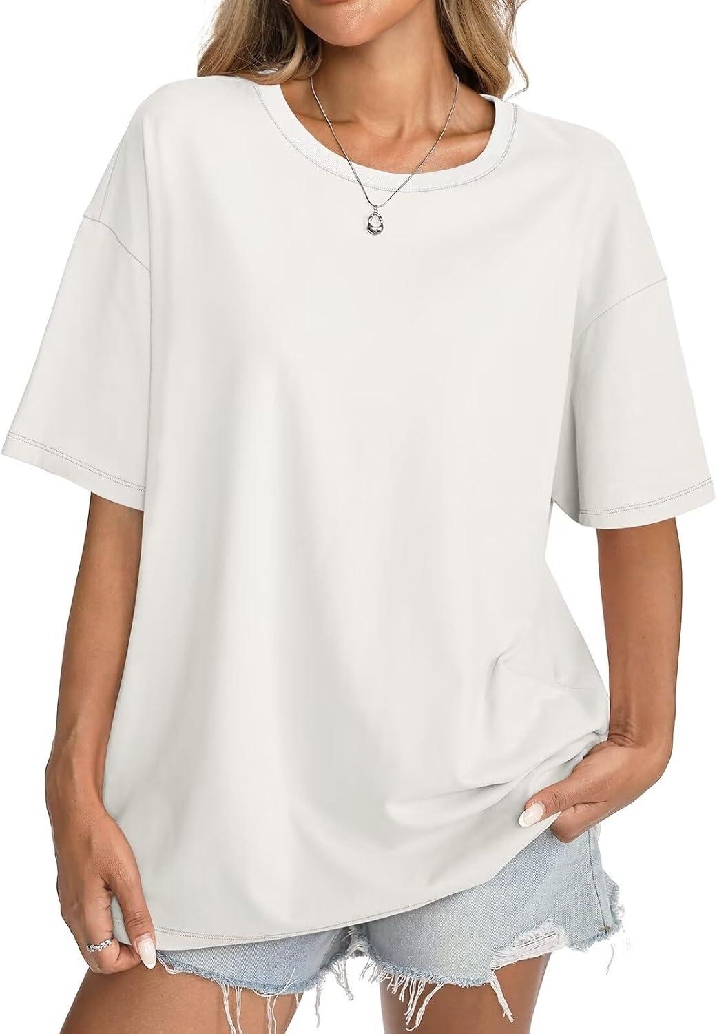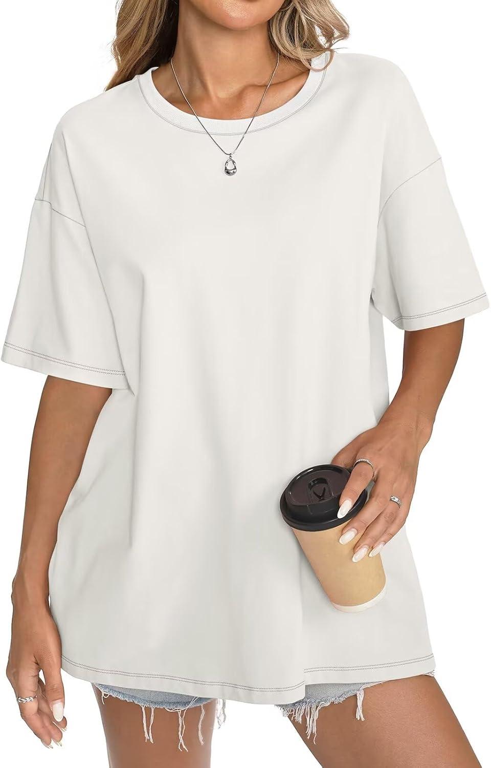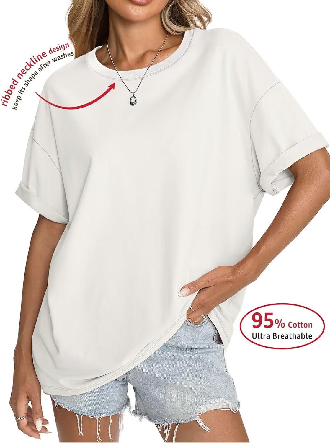Womens Cotton Oversized T Shirts Short Sleeve Tops Ribbed Crewneck Loose Fit Tee Summer Fashion Clothes 2026(White)