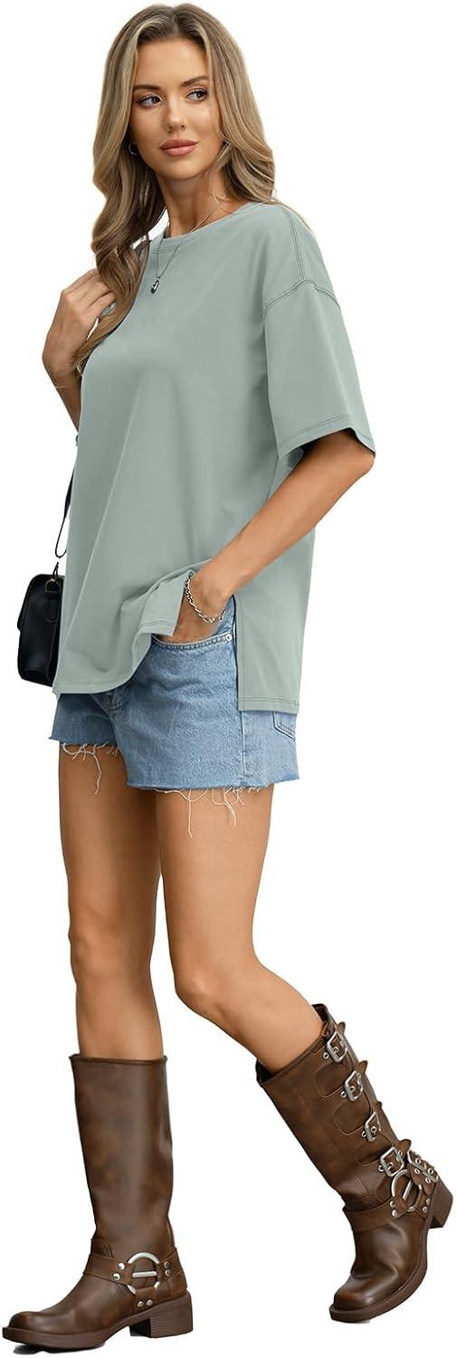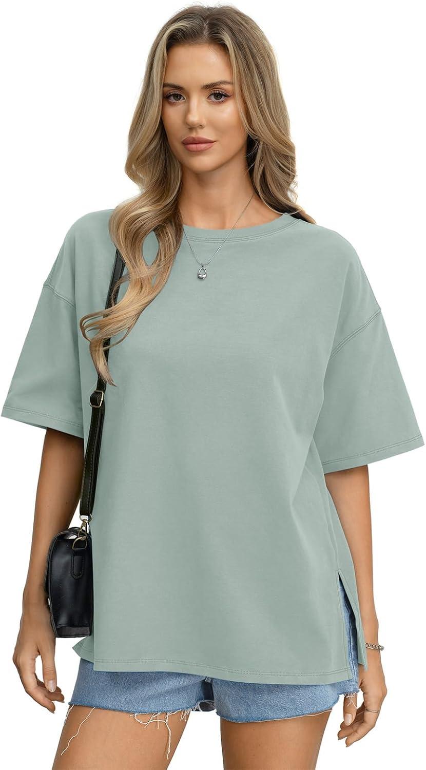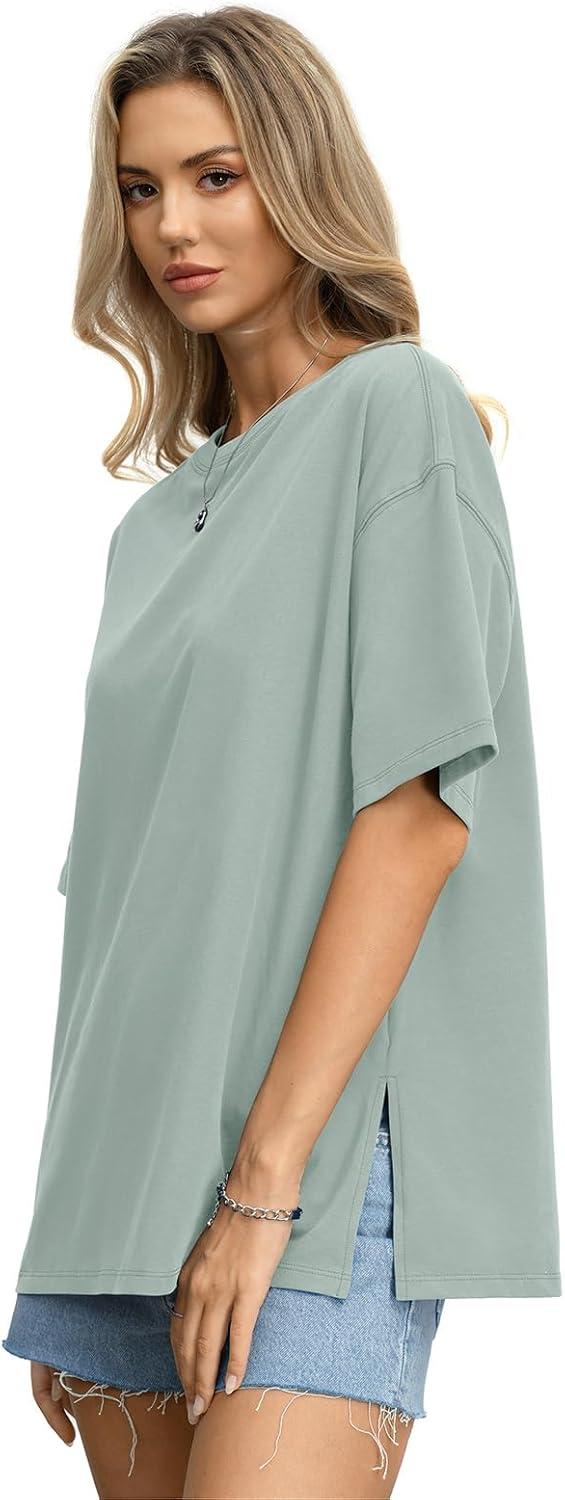 Womens Cotton Oversized T Shirts Side Slit Tops Loose Fit Tee Crewneck Short Sleeve Summer Clothes 2026(Light Green)