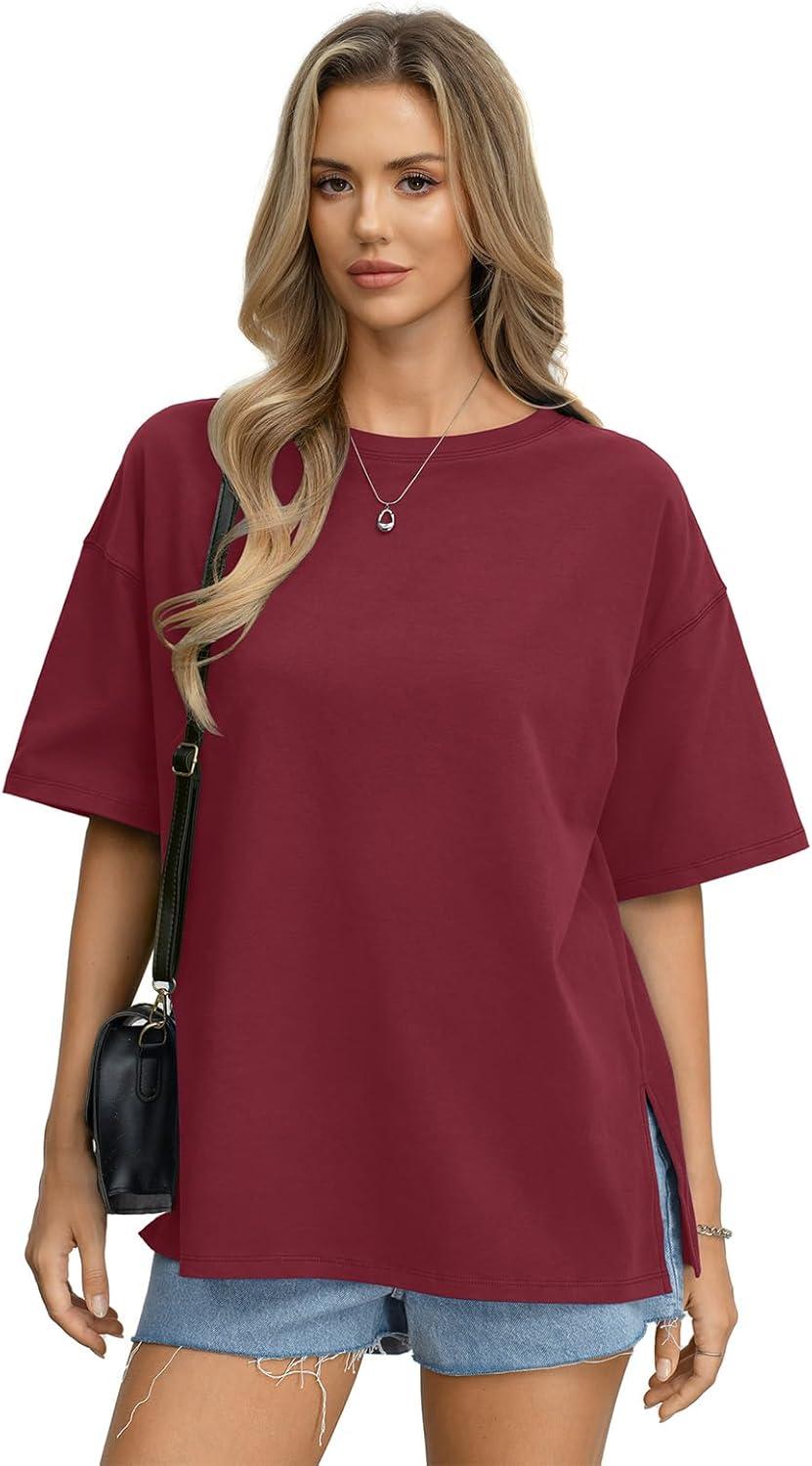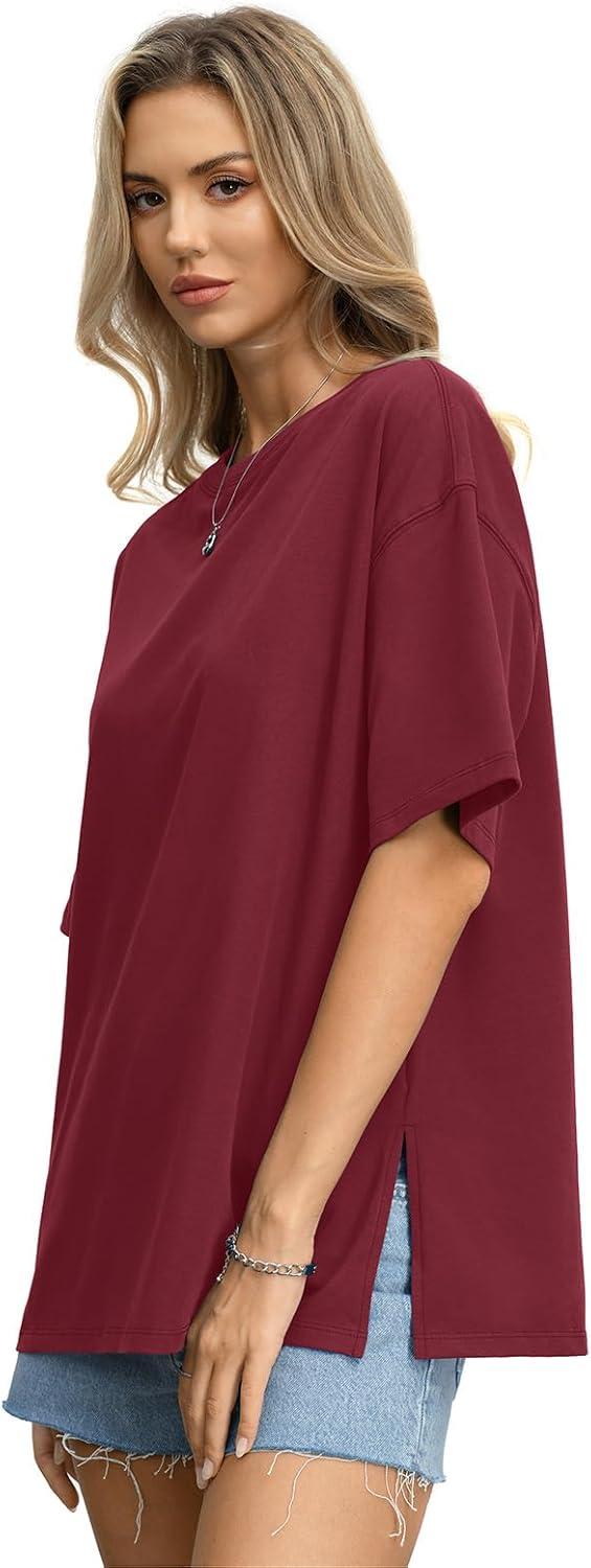 Womens Cotton Oversized T Shirts Side Slit Tops Loose Fit Tee Crewneck Short Sleeve Summer Clothes 2026(Wine Red)