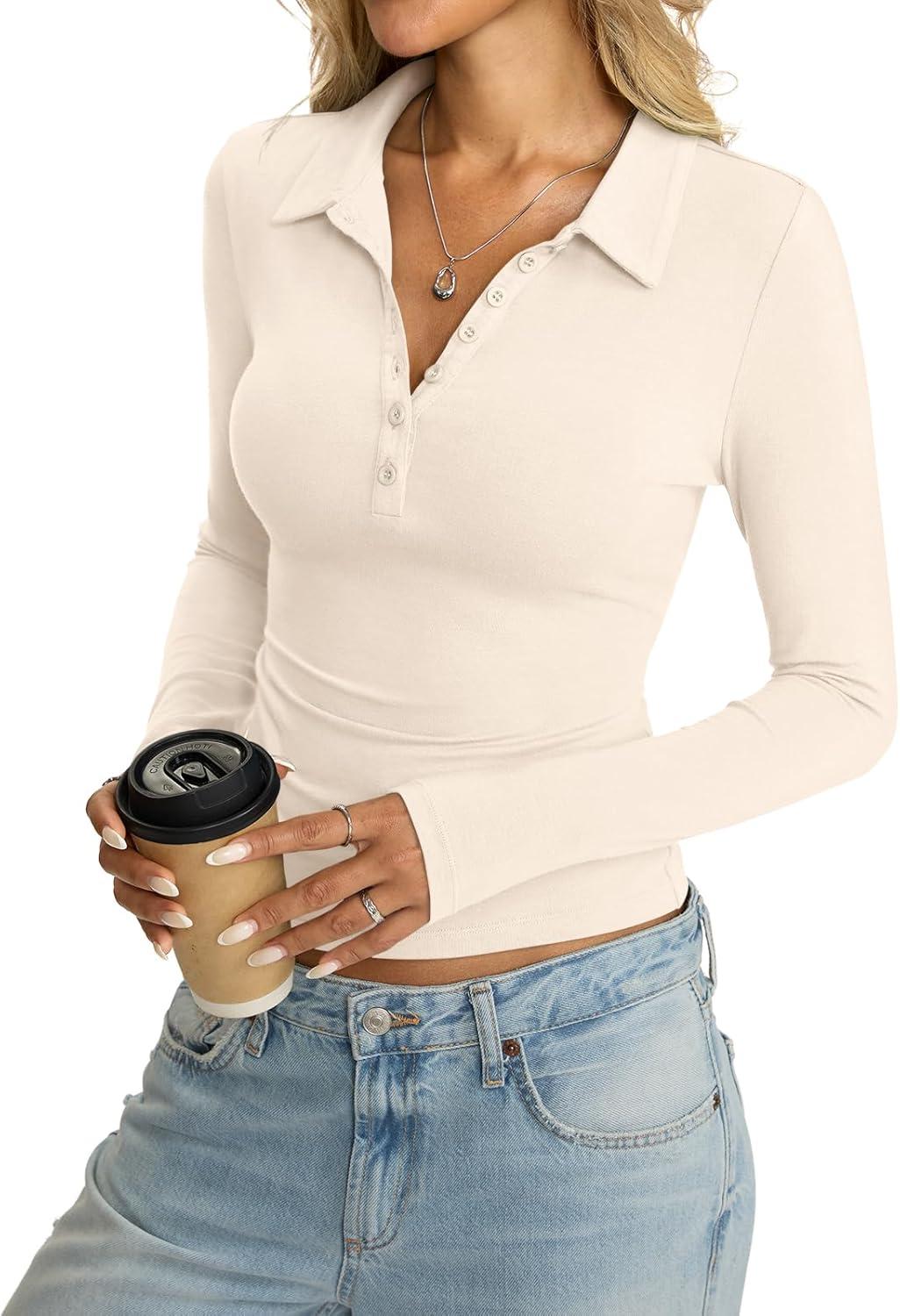 Womens Cotton Polo Collared Shirt Long Sleeve Sexy Deep V Neck Top Button Up Slim Fitted Tee Business Casual Outfit(Apricot)