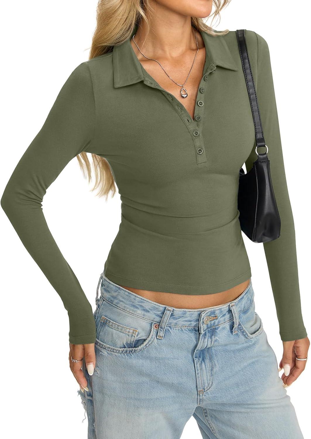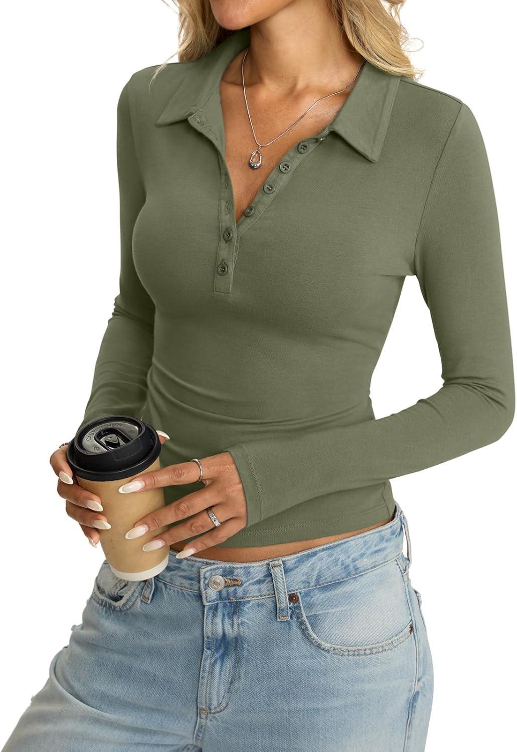 Womens Cotton Polo Collared Shirt Long Sleeve Sexy Deep V Neck Top Button Up Slim Fitted Tee Business Casual Outfit(Army Green)