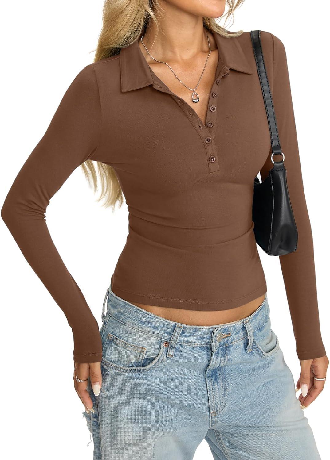 Womens Cotton Polo Collared Shirt Long Sleeve Sexy Deep V Neck Top Button Up Slim Fitted Tee Business Casual Outfit(Brown)