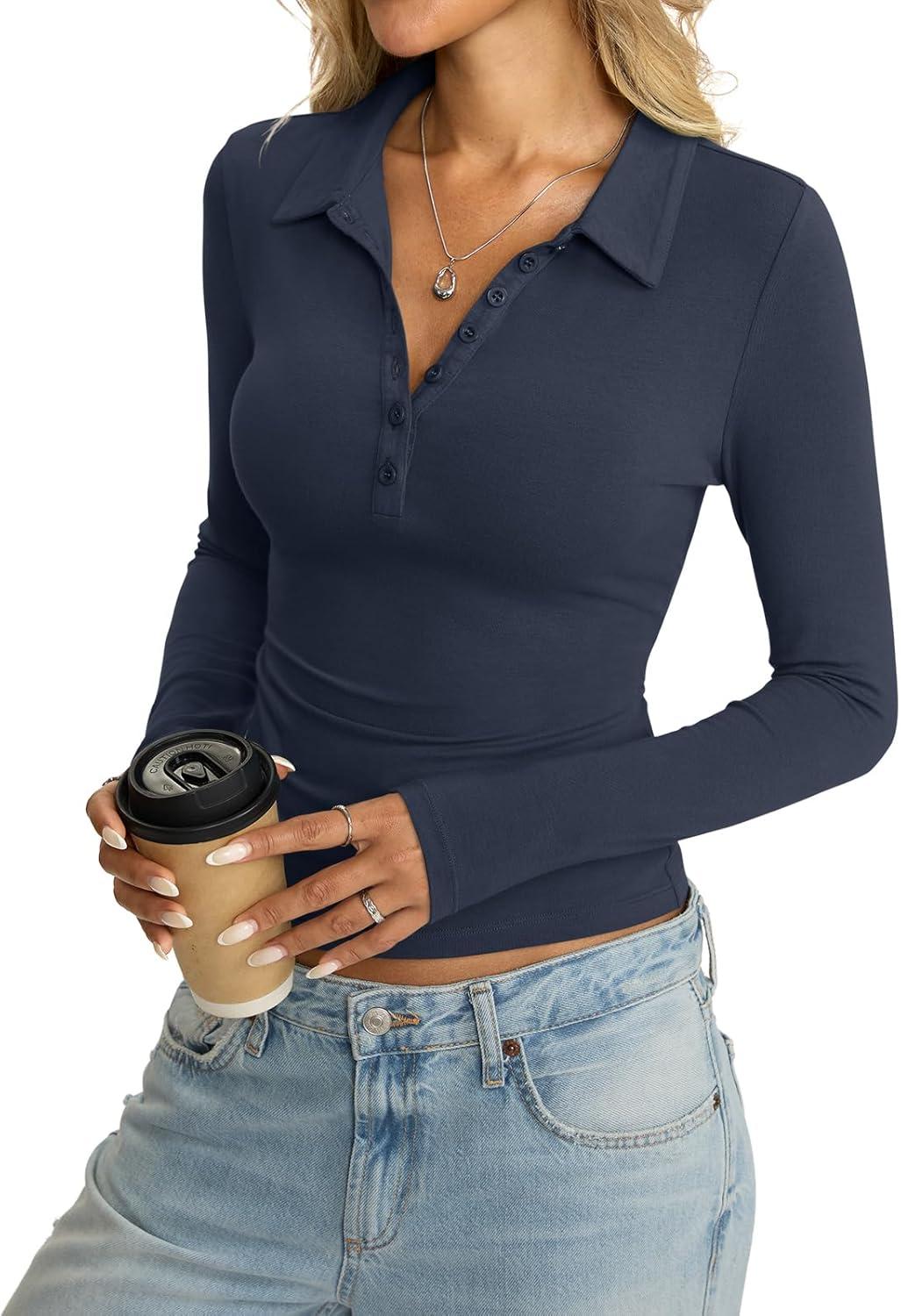 Womens Cotton Polo Collared Shirt Long Sleeve Sexy Deep V Neck Top Button Up Slim Fitted Tee Business Casual Outfit(Navy Blue)
