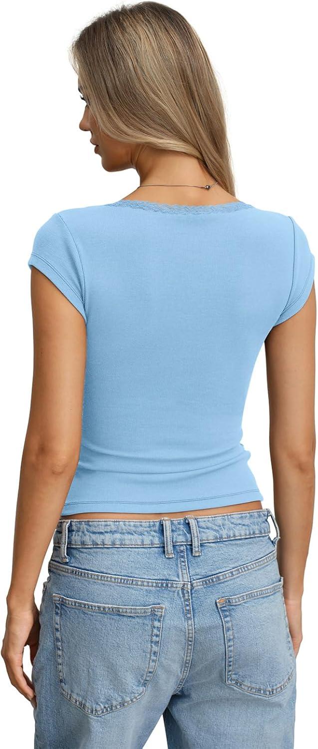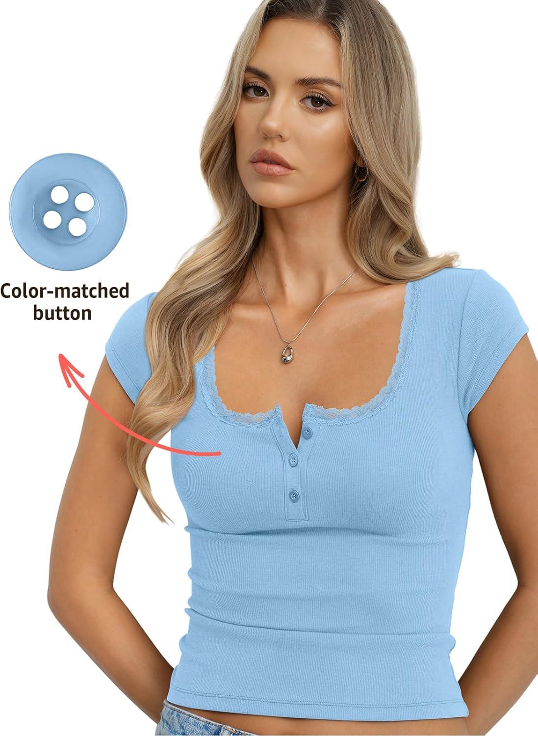 Womens Cotton Ribbed Cap Sleeve Tops Lace Henley Button Down Shirts Cute Crop Tshirts Fitted Going Out Clothes(Light Blue)