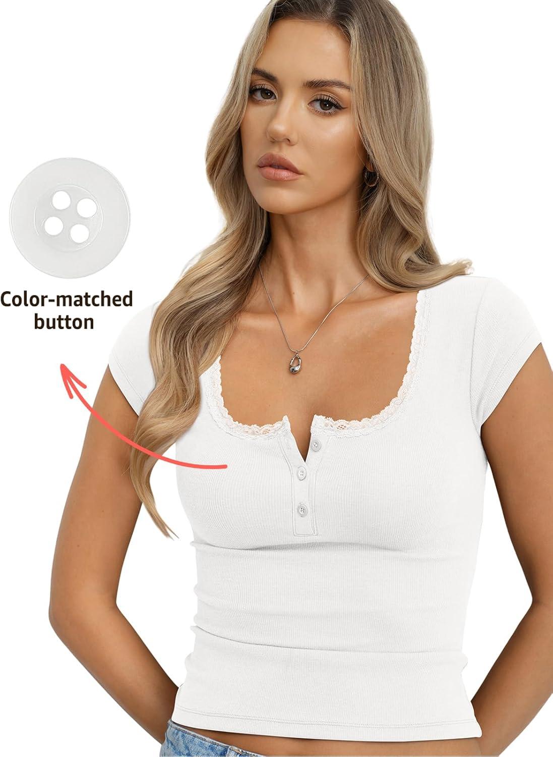 Womens Cotton Ribbed Cap Sleeve Tops Lace Henley Button Down Shirts Cute Crop Tshirts Fitted Going Out Clothes(White)