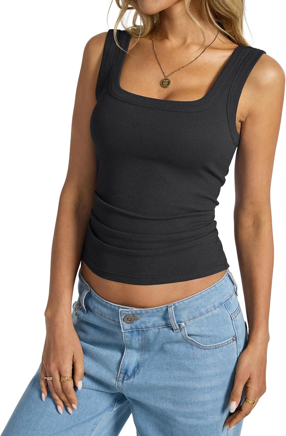 Womens Cotton Ribbed Square Neck Tank Tops Basic Backless Sleeveless Summer Cami Shirts 2025(Black)