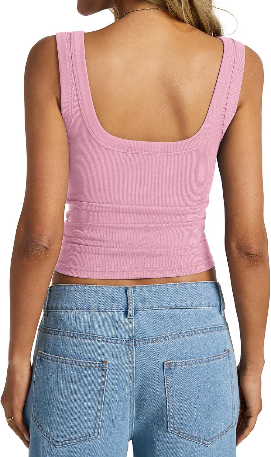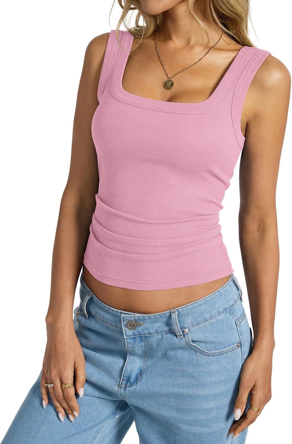 Womens Cotton Ribbed Square Neck Tank Tops Basic Backless Sleeveless Summer Cami Shirts 2025(Pink)