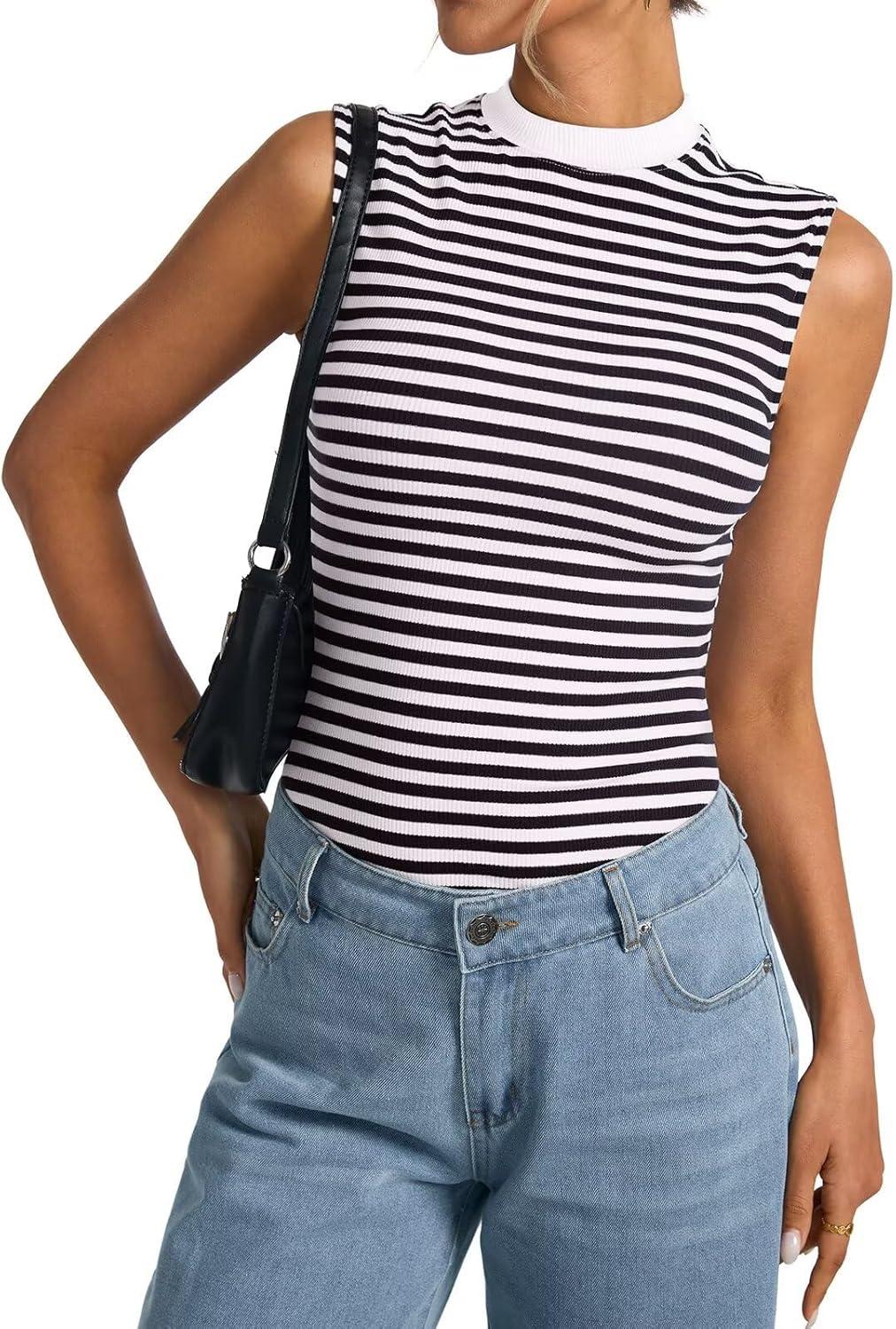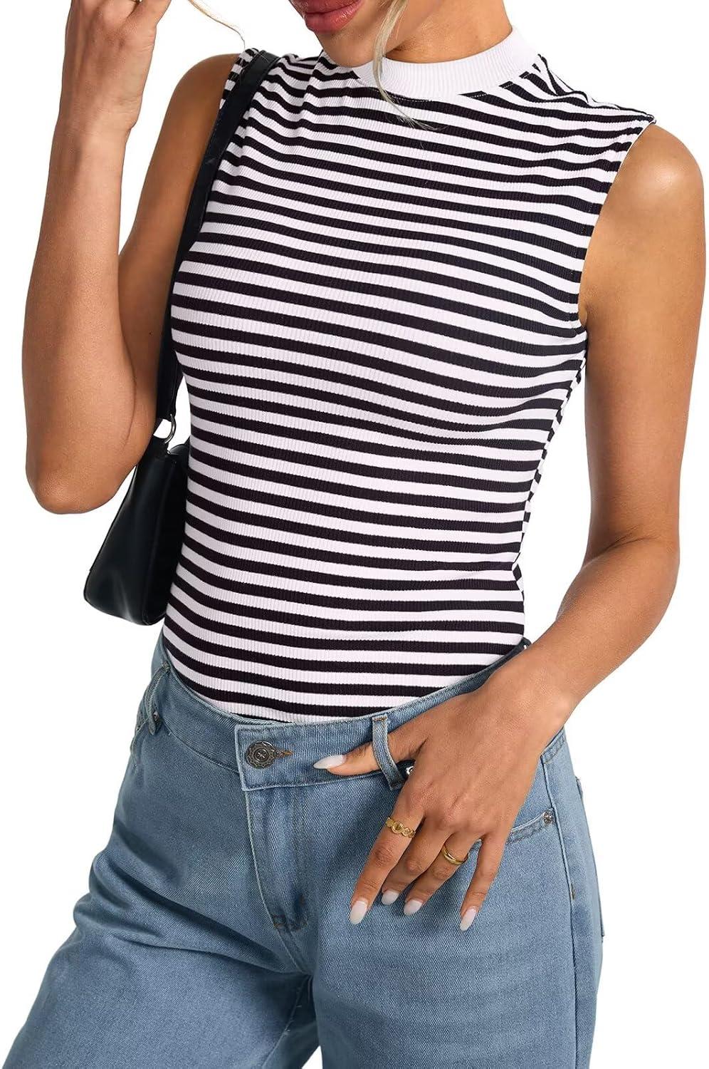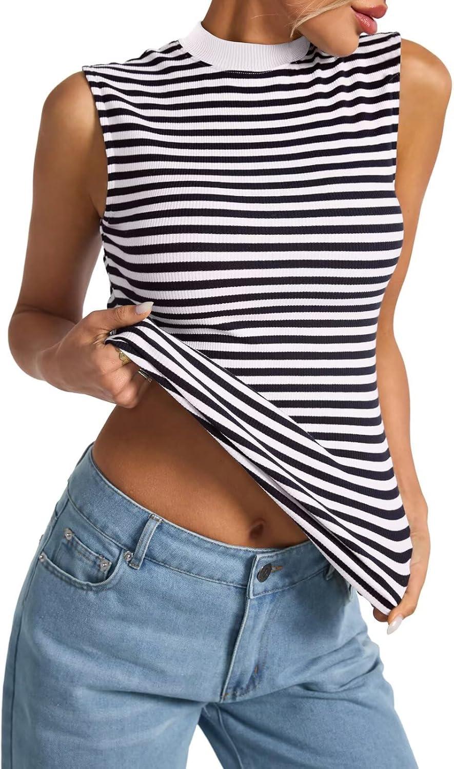 Womens Cotton Ribbed Tank Tops Sleeveless Mock High Neck Top Fitted Basic Summer Cami Shirts Y2K Outfits 2025(Black Stripe)