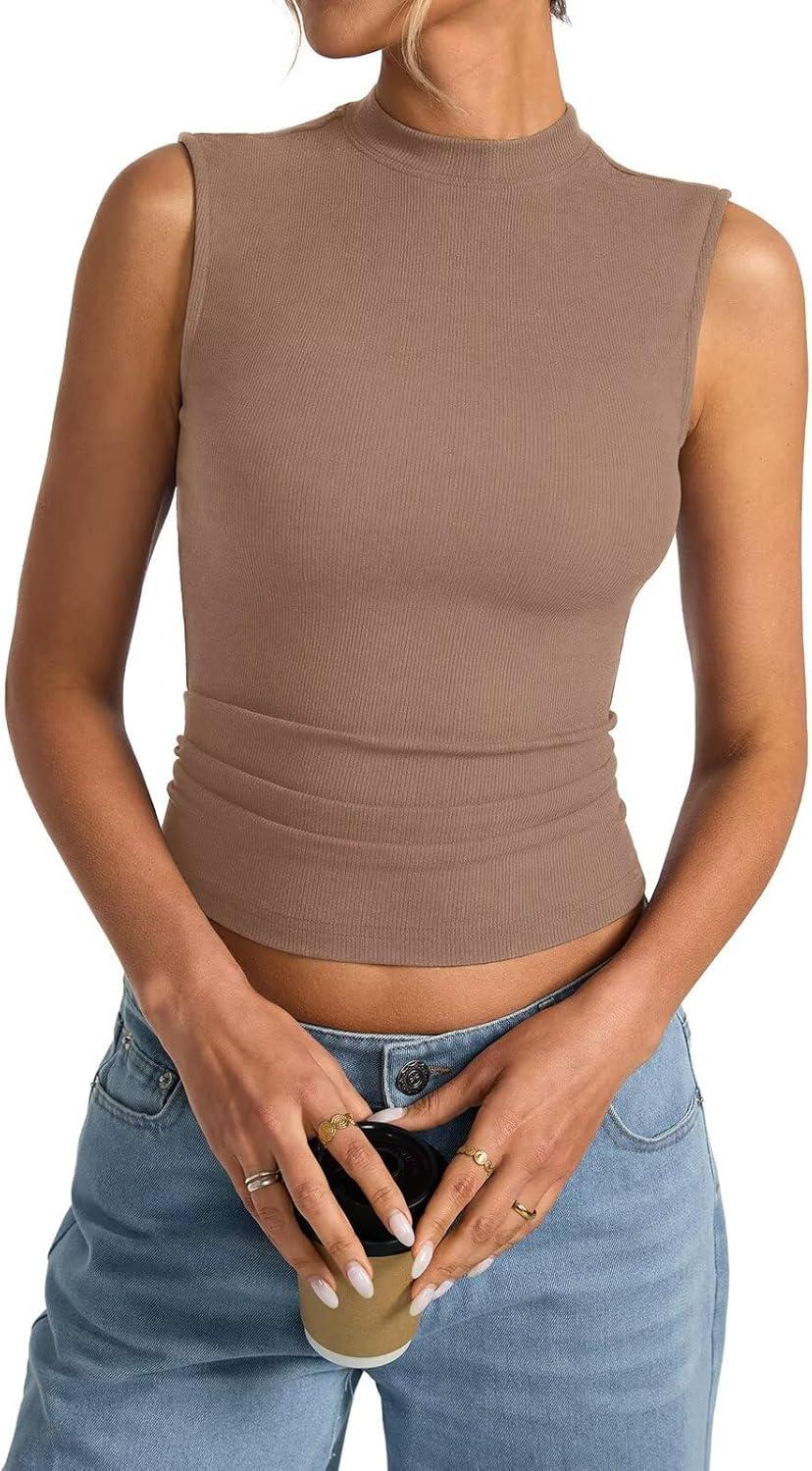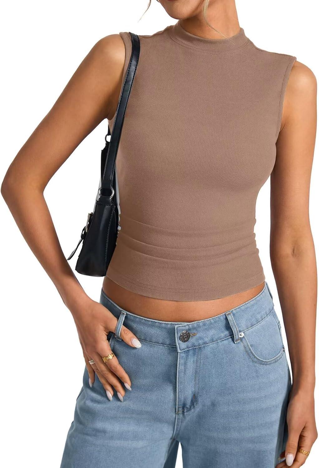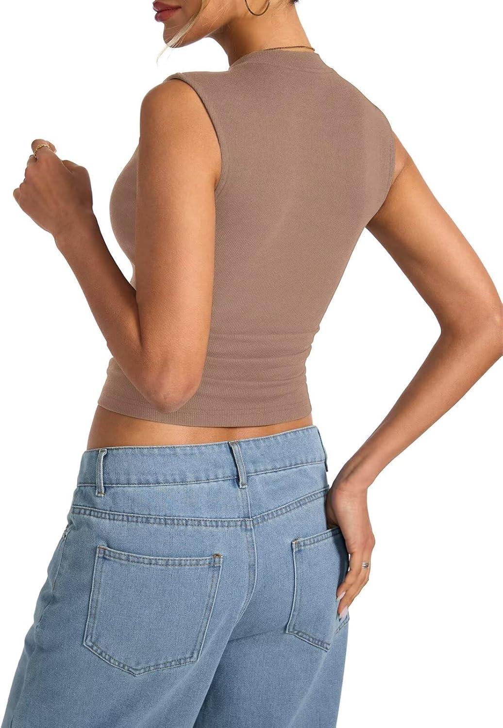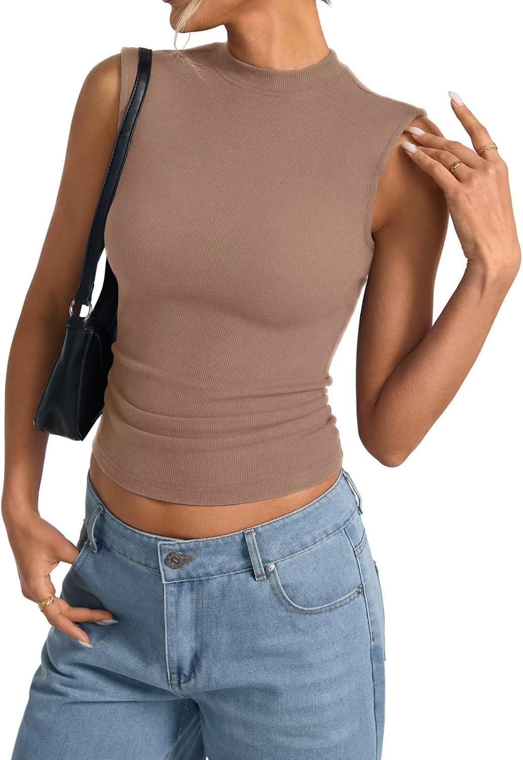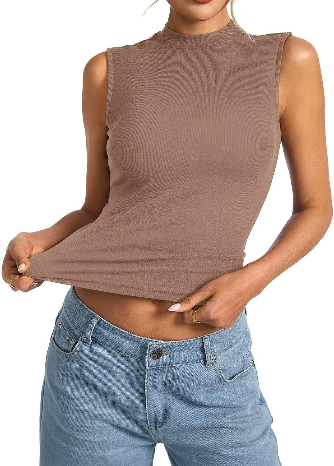 Womens Cotton Ribbed Tank Tops Sleeveless Mock High Neck Top Fitted Basic Summer Cami Shirts Y2K Outfits 2025(Brown)