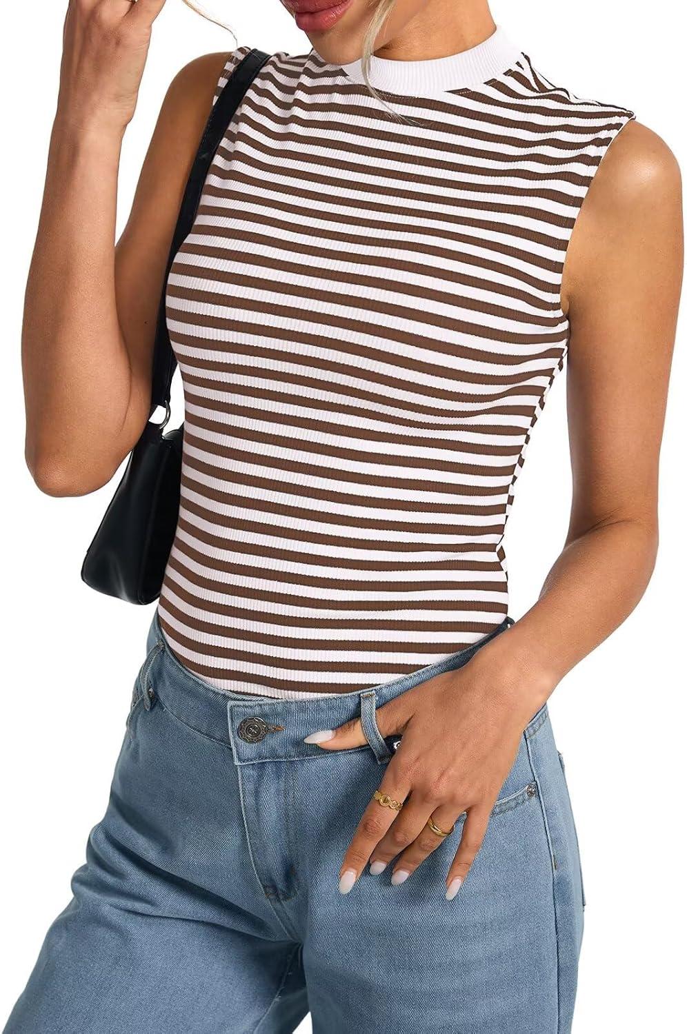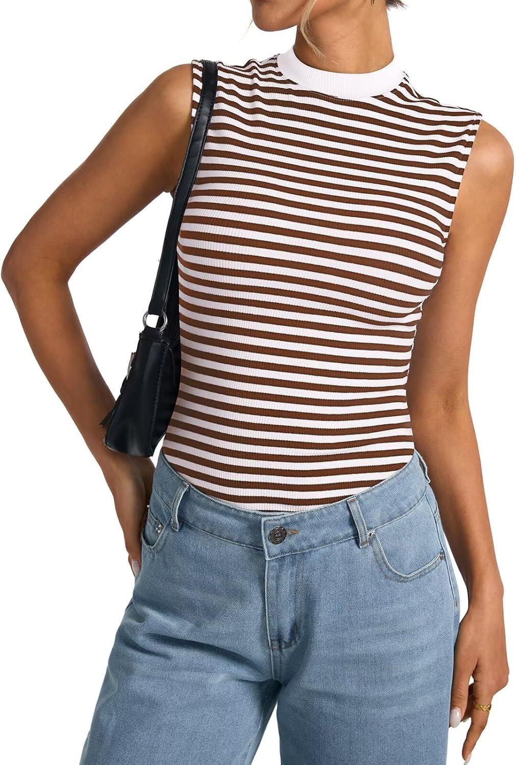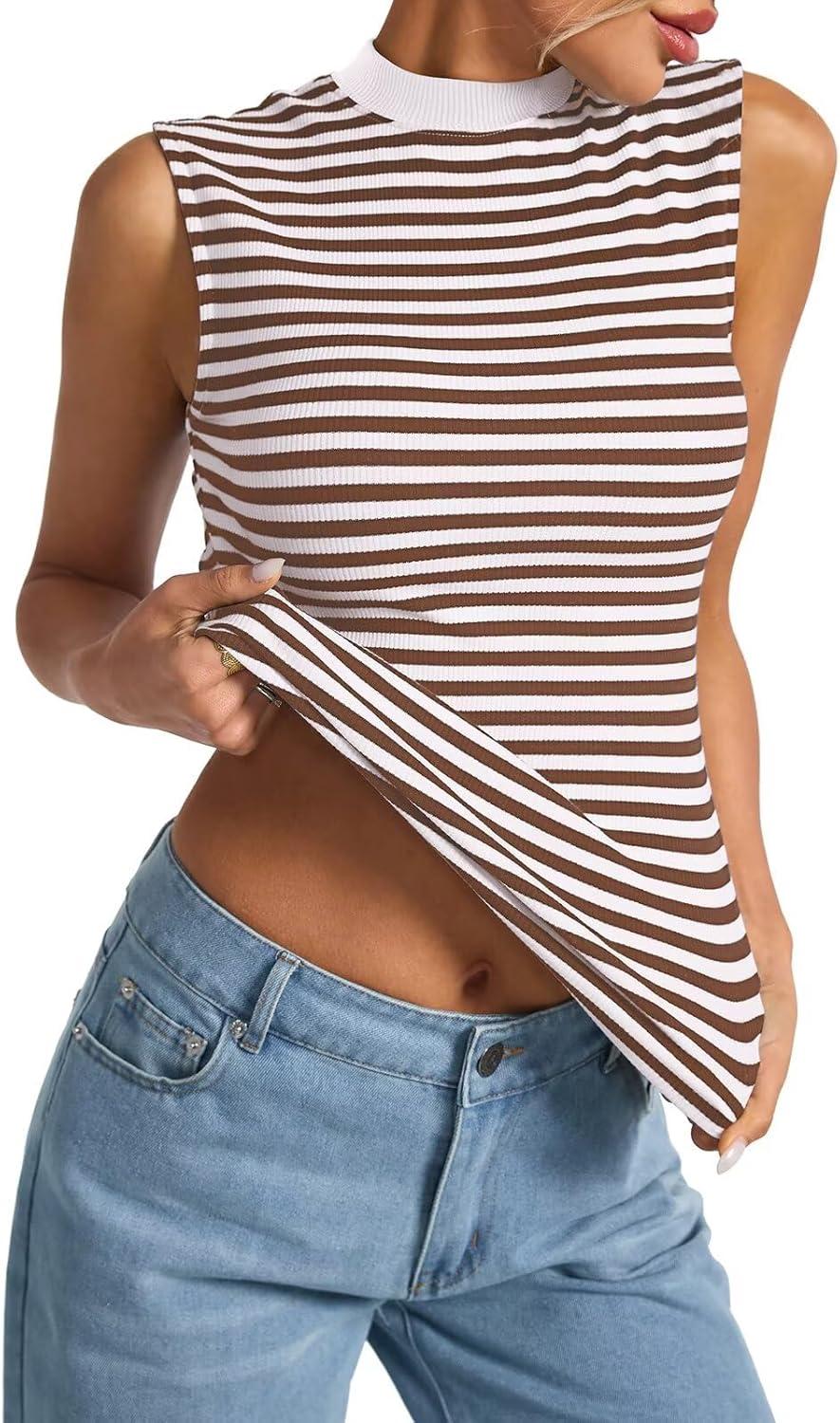 Womens Cotton Ribbed Tank Tops Sleeveless Mock High Neck Top Fitted Basic Summer Cami Shirts Y2K Outfits 2025(Coffee Stripe)