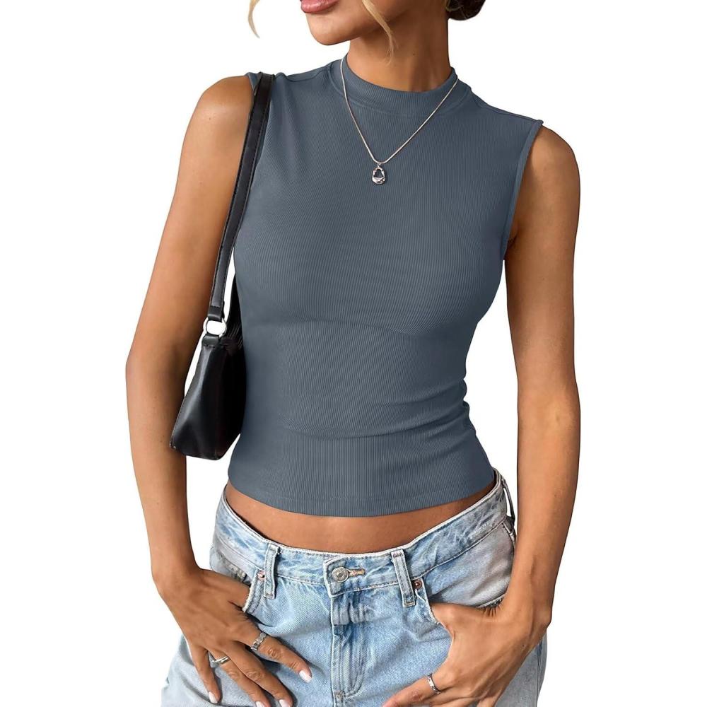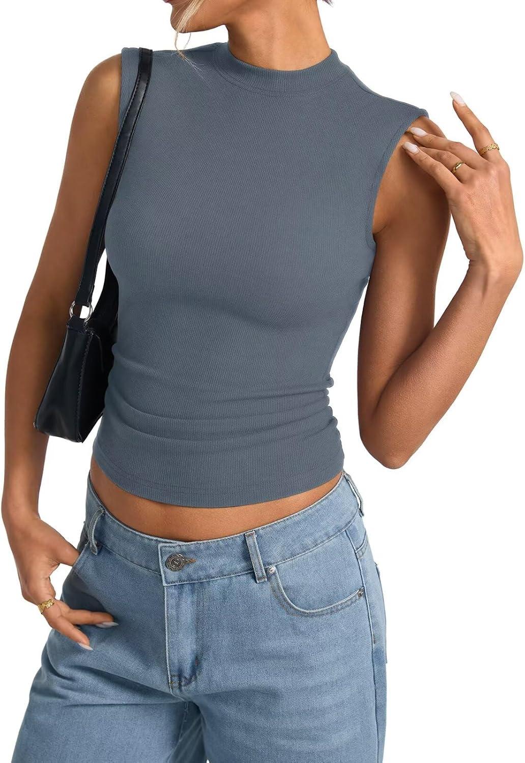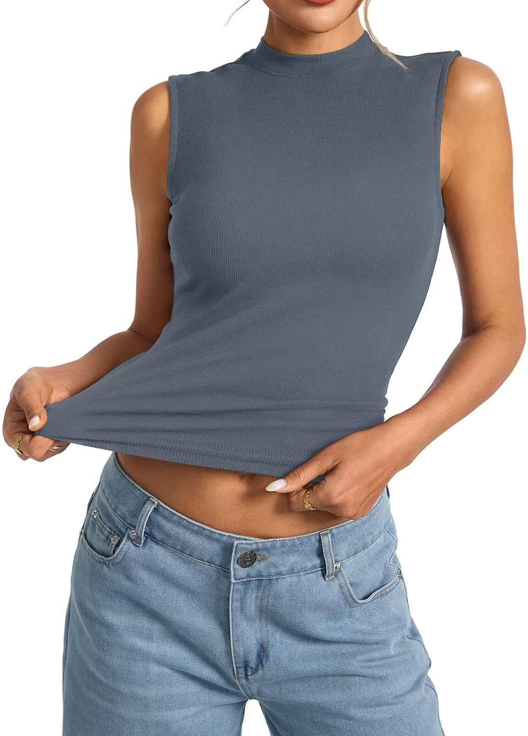 Womens Cotton Ribbed Tank Tops Sleeveless Mock High Neck Top Fitted Basic Summer Cami Shirts Y2K Outfits 2025(Gray Blue)