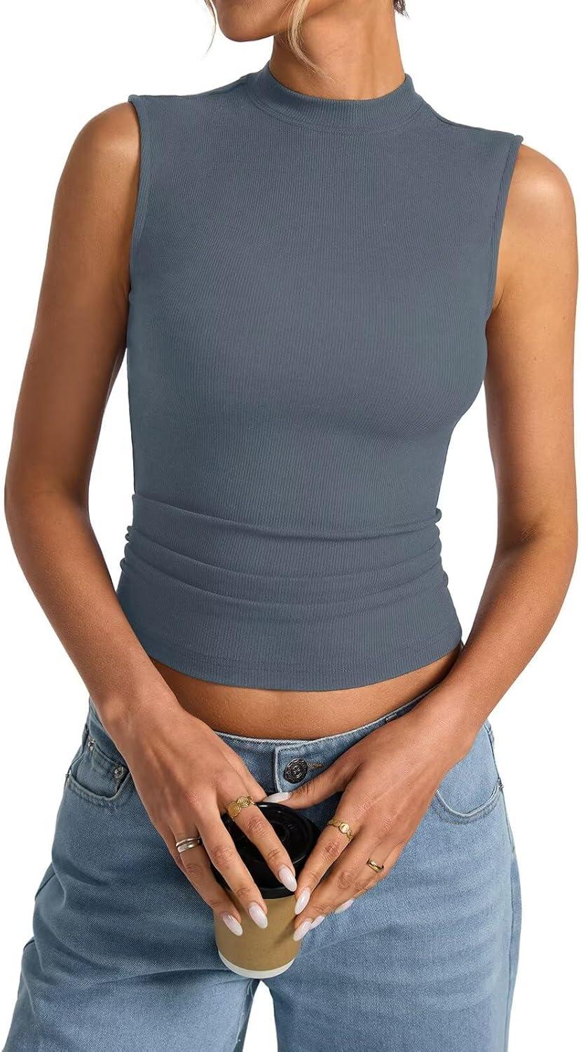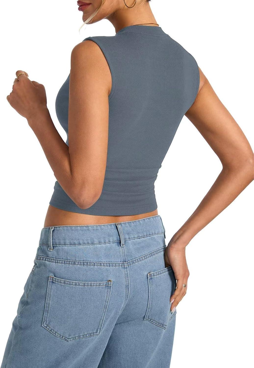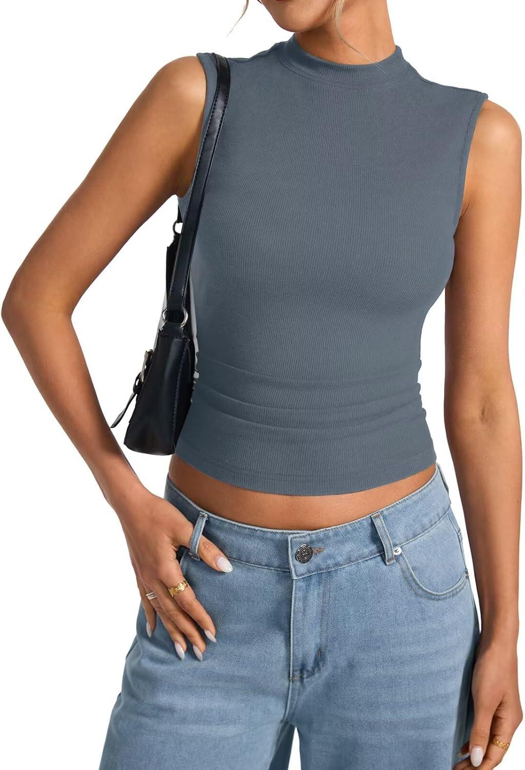 Womens Cotton Ribbed Tank Tops Sleeveless Mock High Neck Top Fitted Basic Summer Cami Shirts Y2K Outfits 2025(Gray Blue)