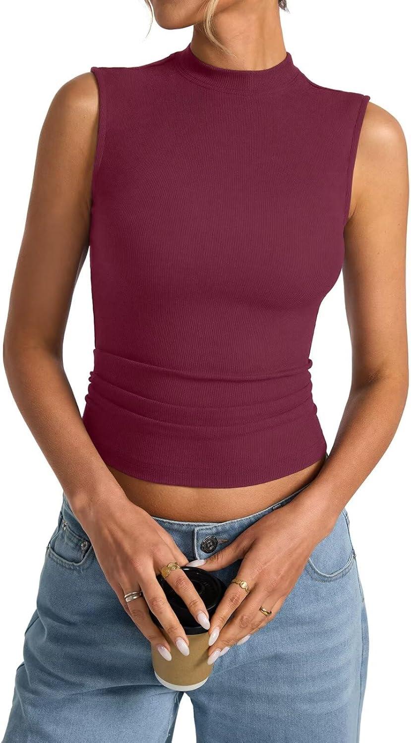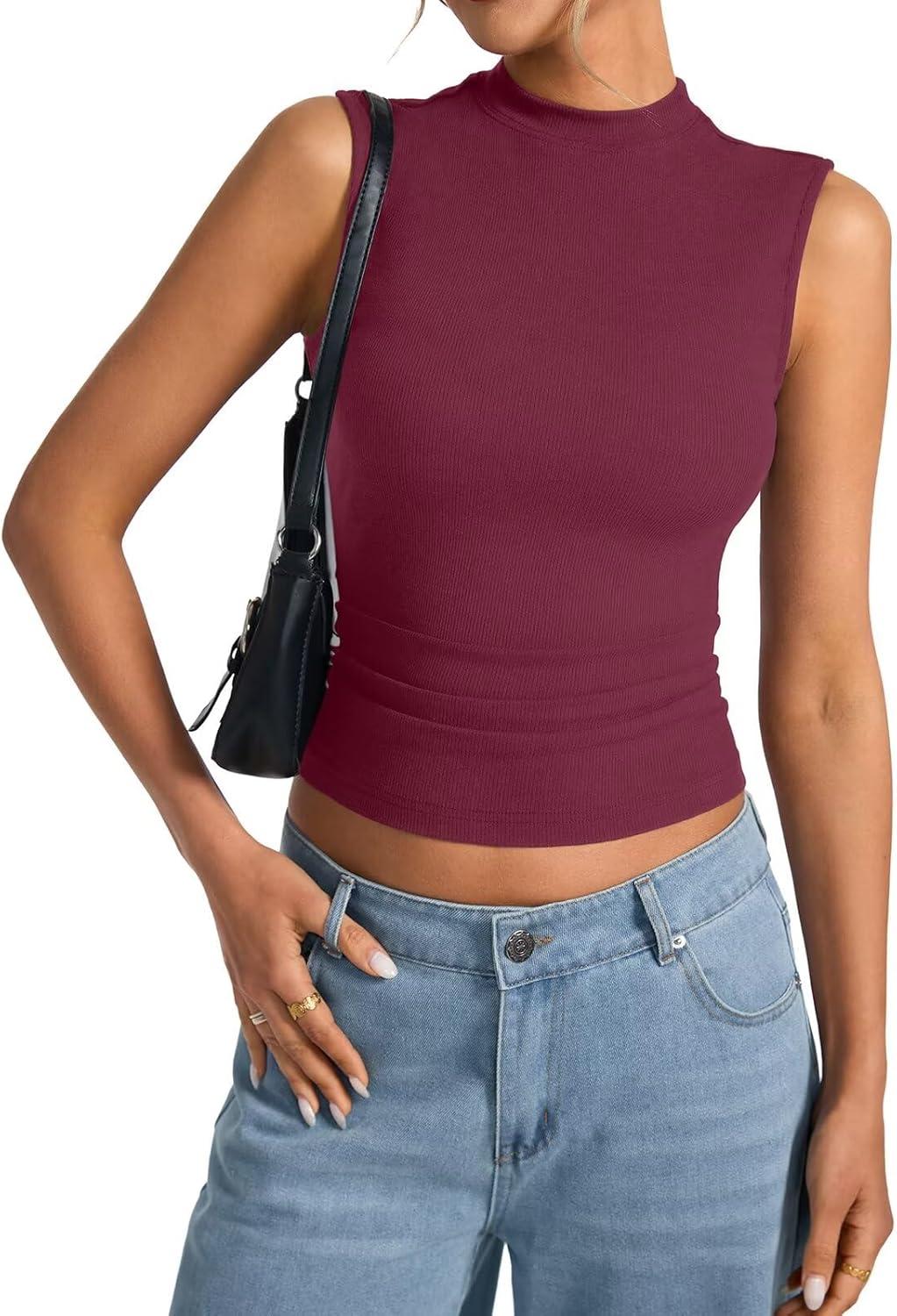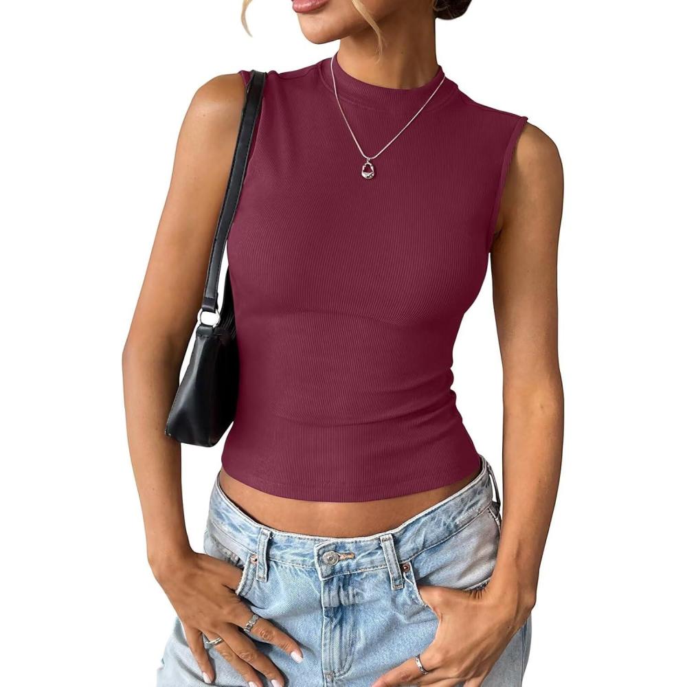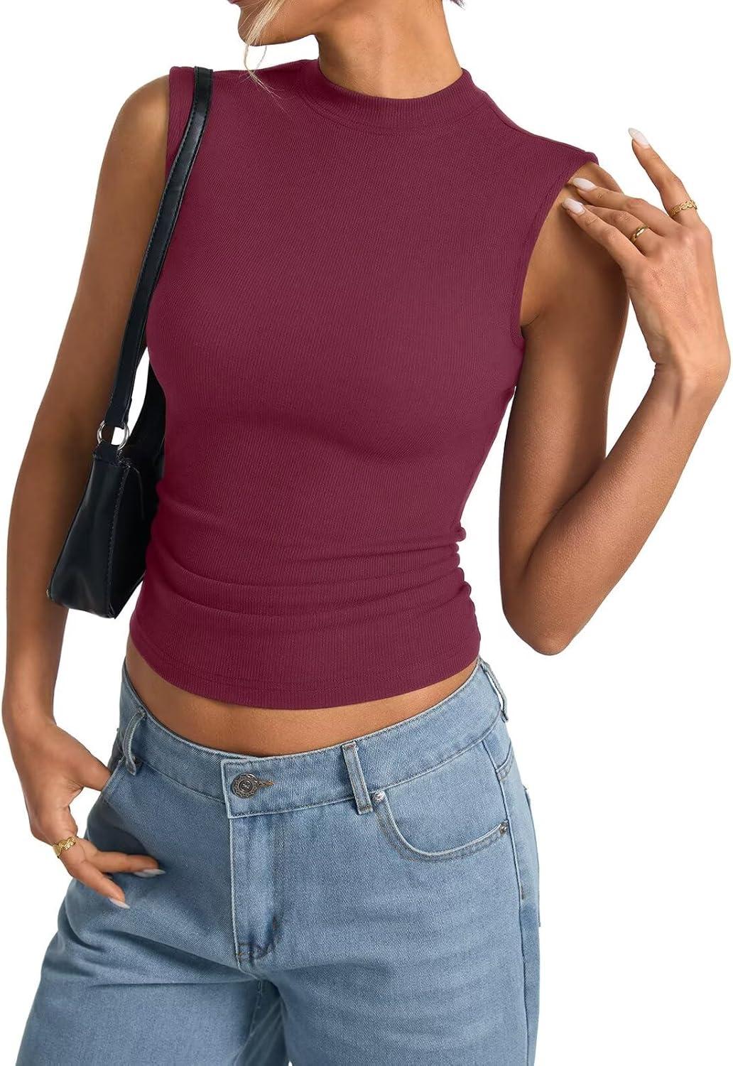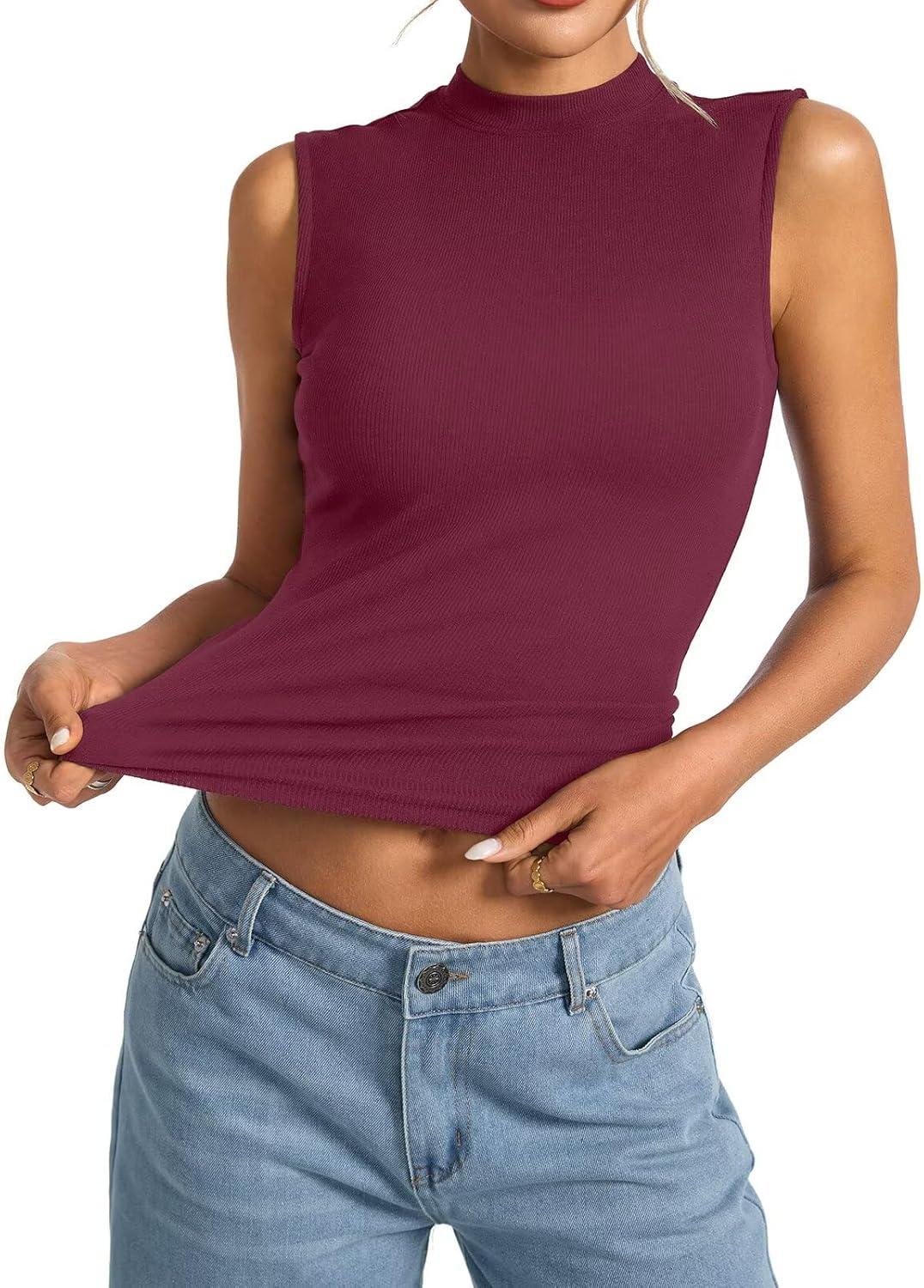 Womens Cotton Ribbed Tank Tops Sleeveless Mock High Neck Top Fitted Basic Summer Cami Shirts Y2K Outfits 2025(Wine Red)