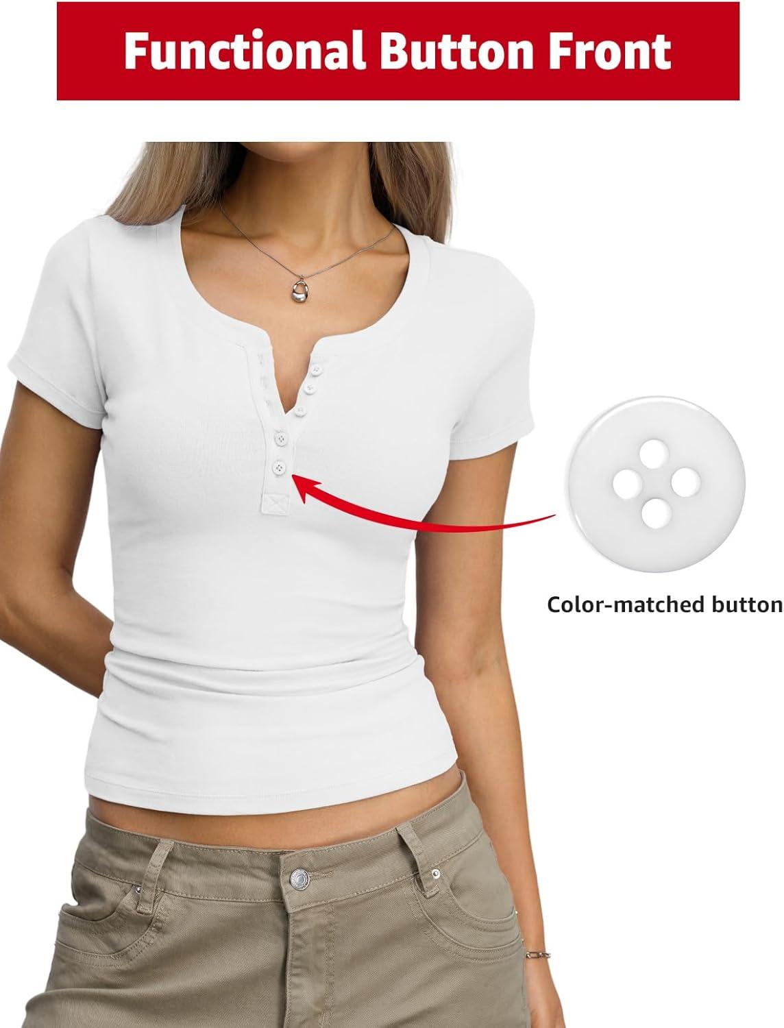 Womens Cotton Short Sleeve Henley Shirts Sexy V Neck Tops Slim Fit Basic Casual Tshirts Summer Outfits 2026(True White)