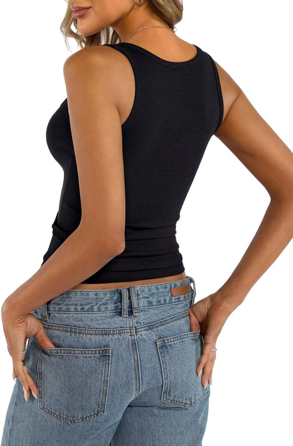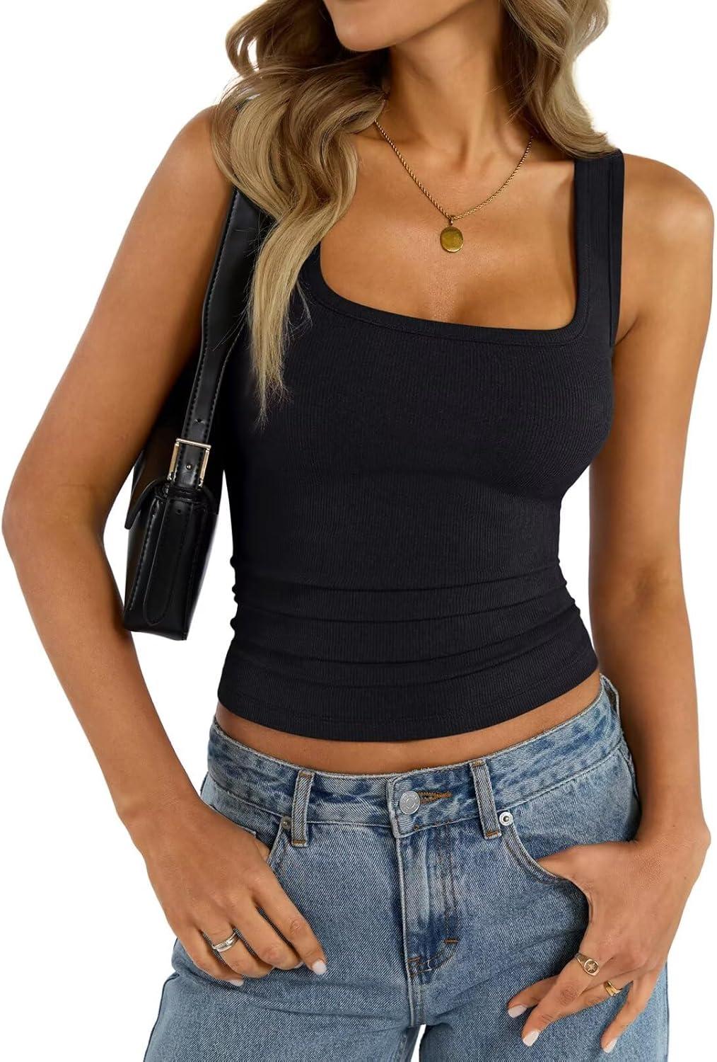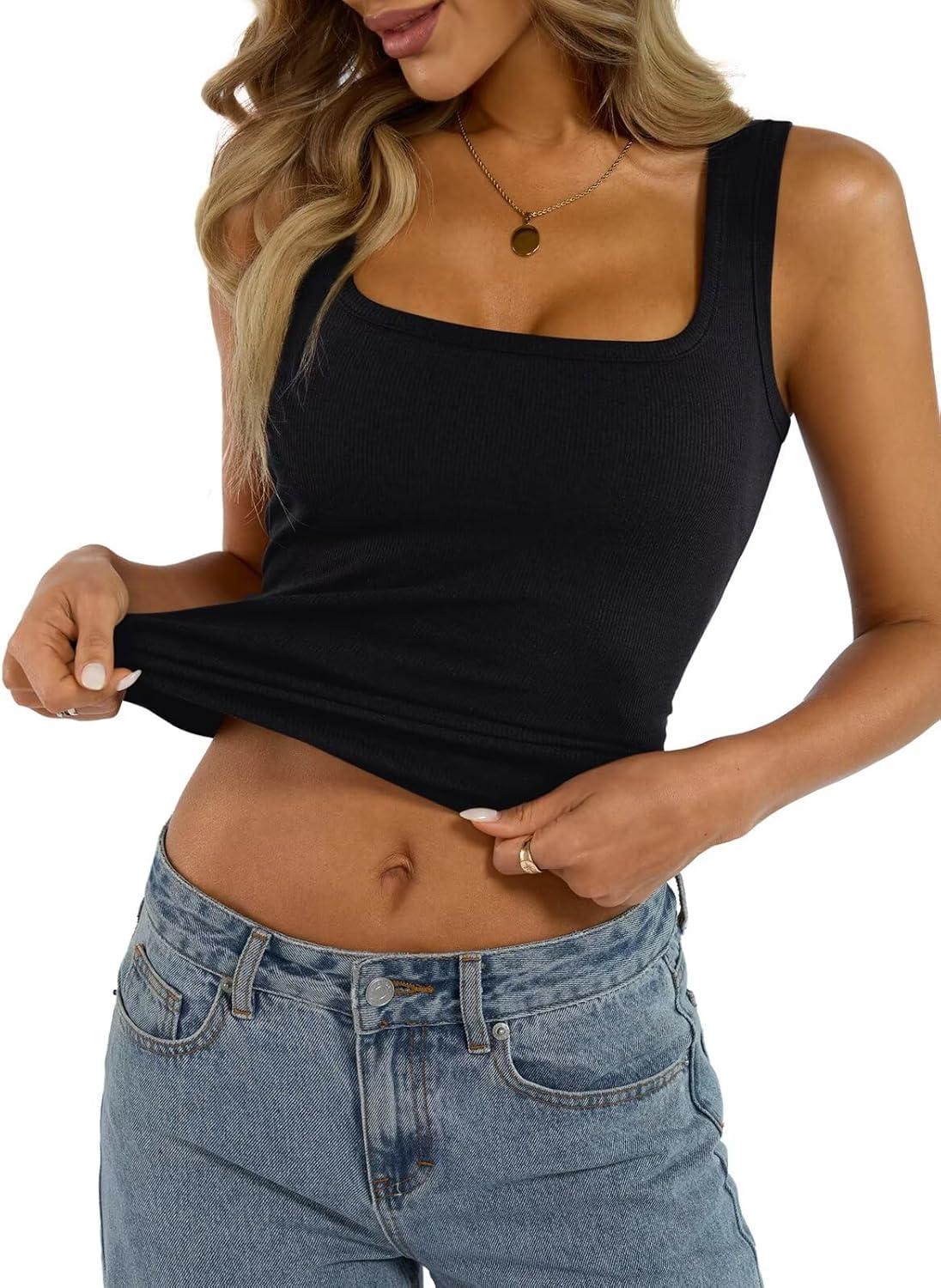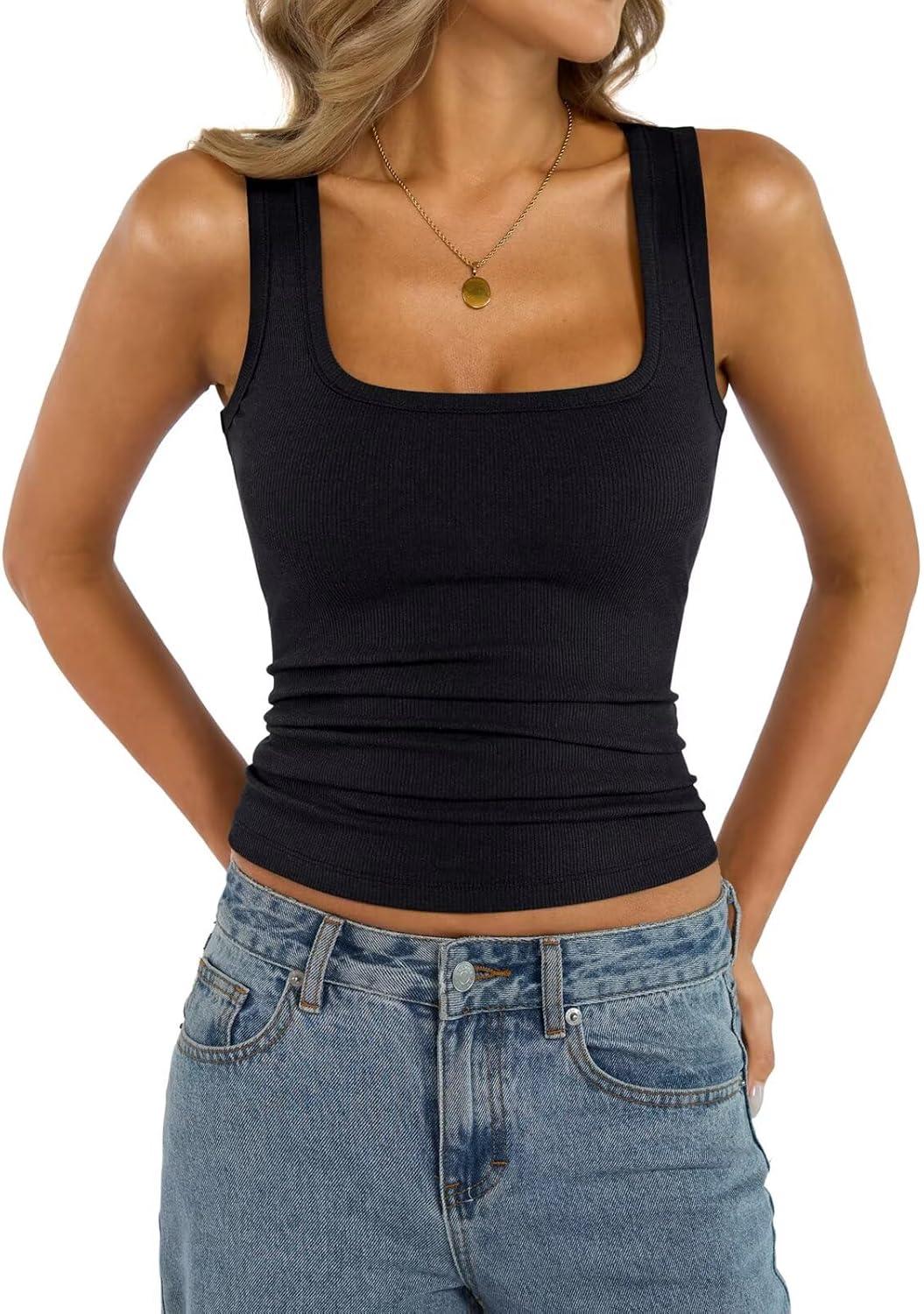 Womens Cotton Square Neck Ribbed Tank Tops Fitted Thin Shoulder Strap Sleeveless Basic Summer Cami Clothes 2025(Black)