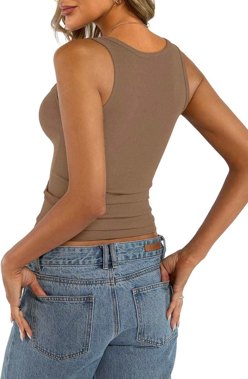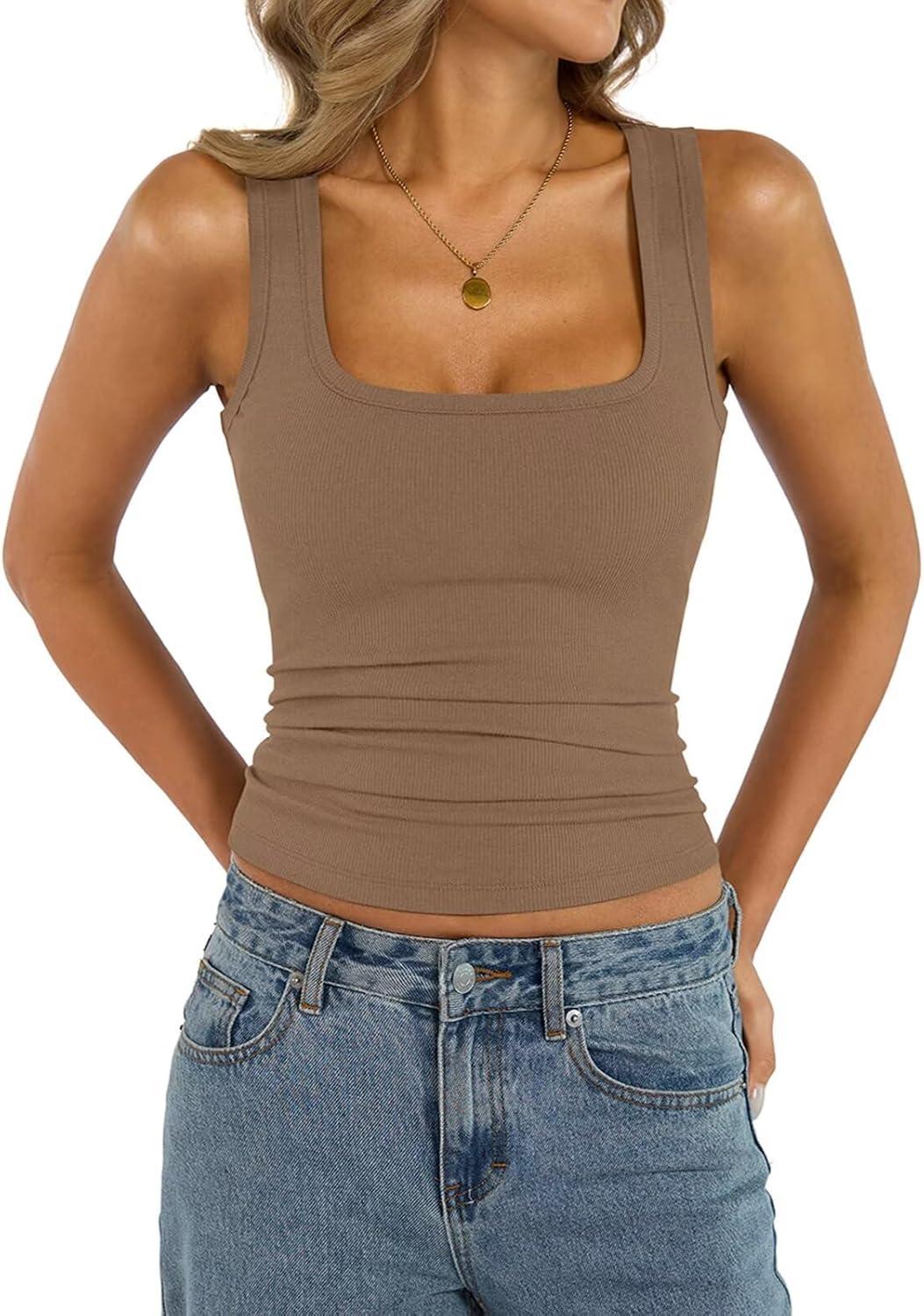 Womens Cotton Square Neck Ribbed Tank Tops Fitted Thin Shoulder Strap Sleeveless Basic Summer Cami Clothes 2025(Brown)