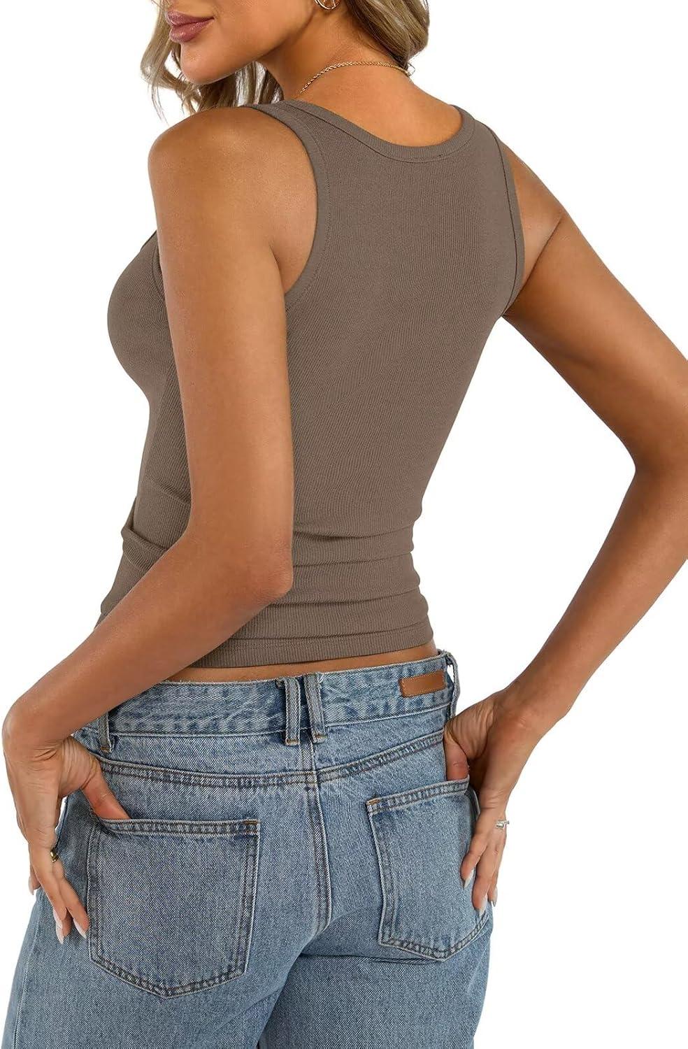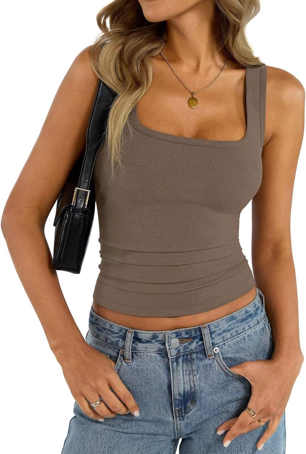 Womens Cotton Square Neck Ribbed Tank Tops Fitted Thin Shoulder Strap Sleeveless Basic Summer Cami Clothes 2025(Coffee)