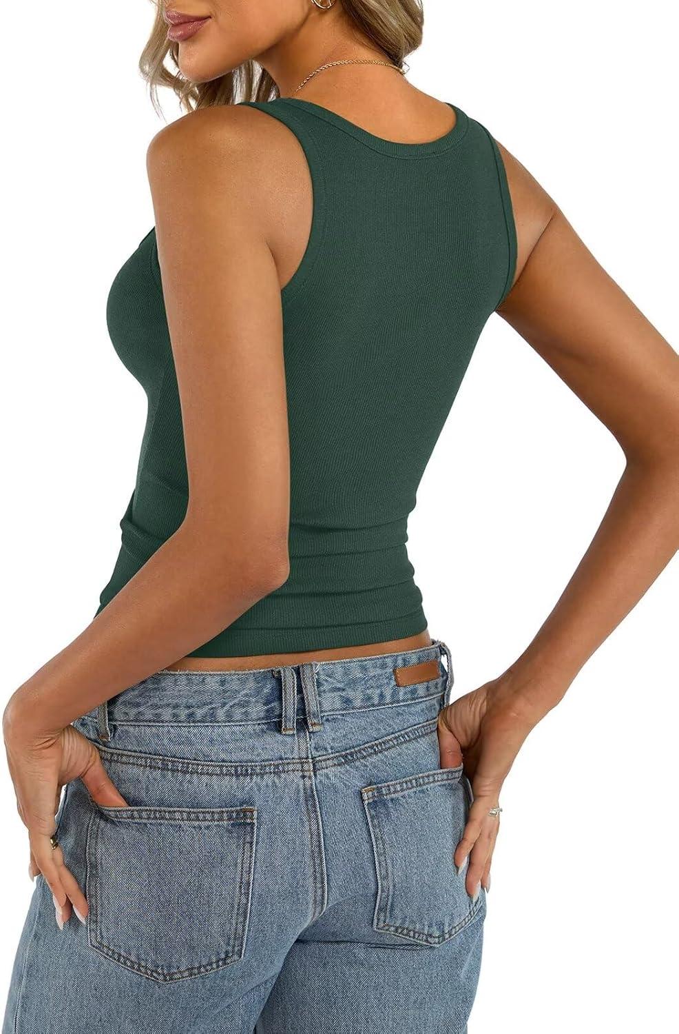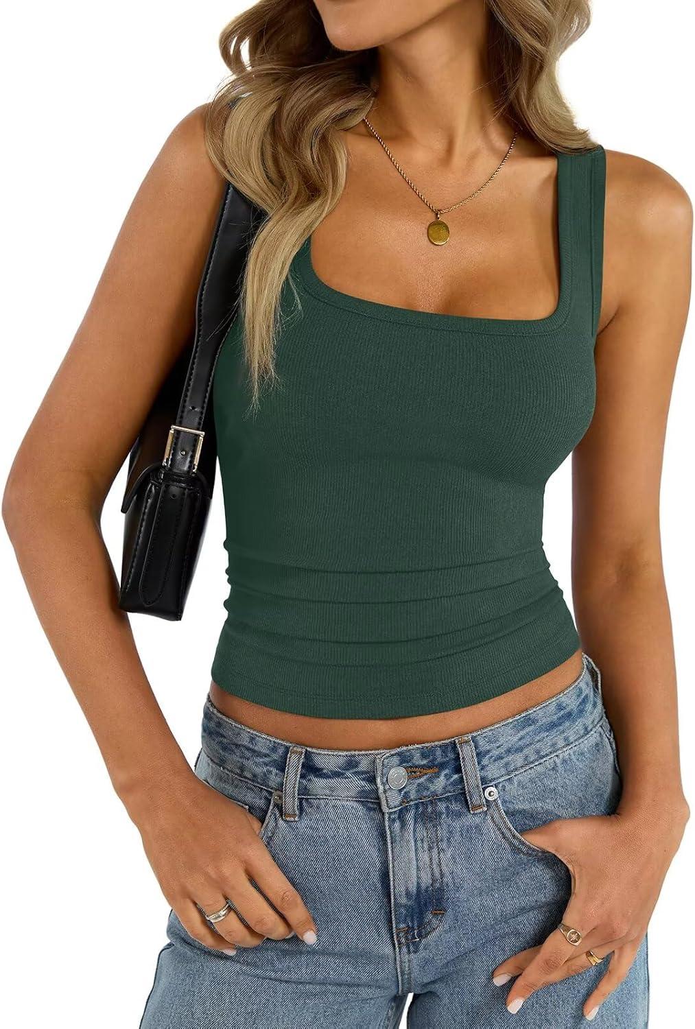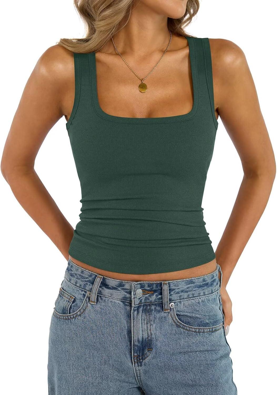 Womens Cotton Square Neck Ribbed Tank Tops Fitted Thin Shoulder Strap Sleeveless Basic Summer Cami Clothes 2025(Green)