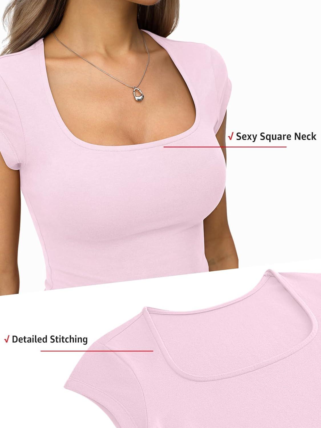 Womens Cotton Square Neck Short Sleeve Shirts Slim Fit Cap Sleeve Tops Summer Basic Low Cut Tee Fashion Clothes(Baby Pink)