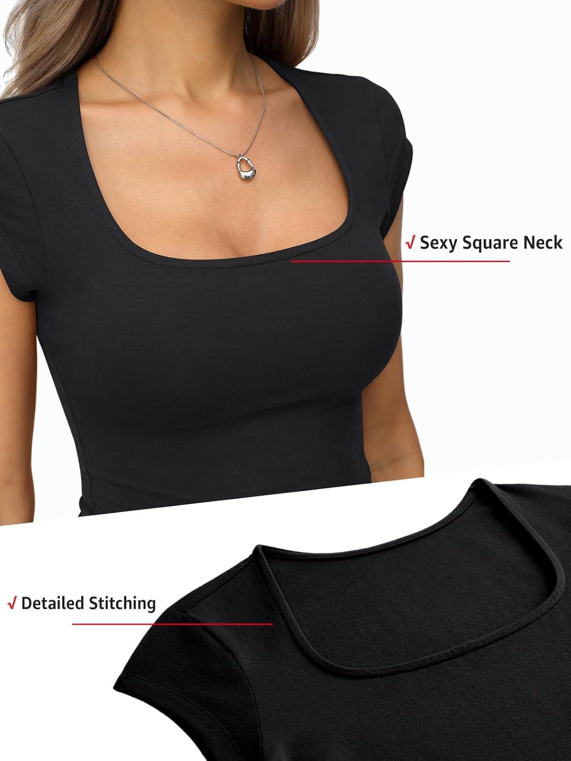 Womens Cotton Square Neck Short Sleeve Shirts Slim Fit Cap Sleeve Tops Summer Basic Low Cut Tee Fashion Clothes(True Black)