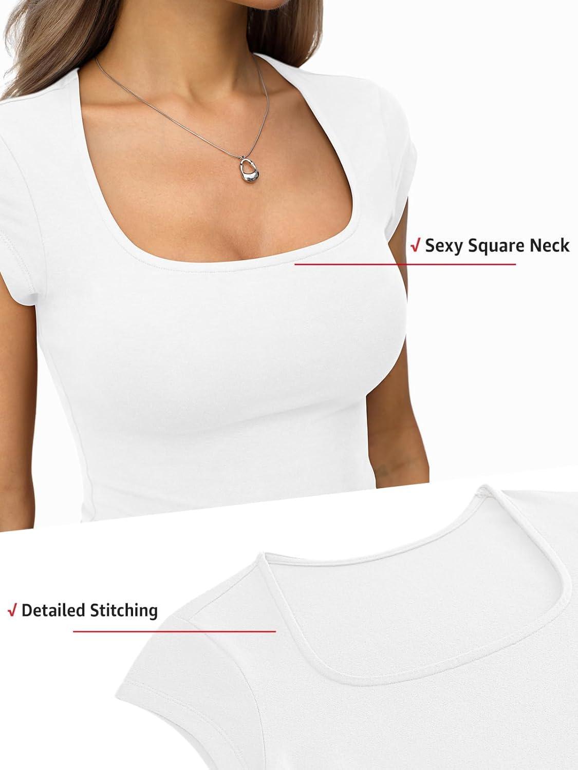 Womens Cotton Square Neck Short Sleeve Shirts Slim Fit Cap Sleeve Tops Summer Basic Low Cut Tee Fashion Clothes(Ture White)