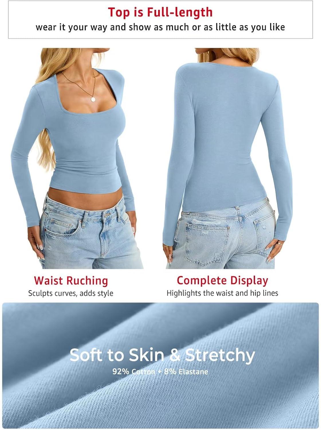 Womens Cotton Tops Long Sleeve T Shirts Square Neck Y2k Tops Slim Fit Going Out Fall Fashion Clothes 2025(Baby Blue)
