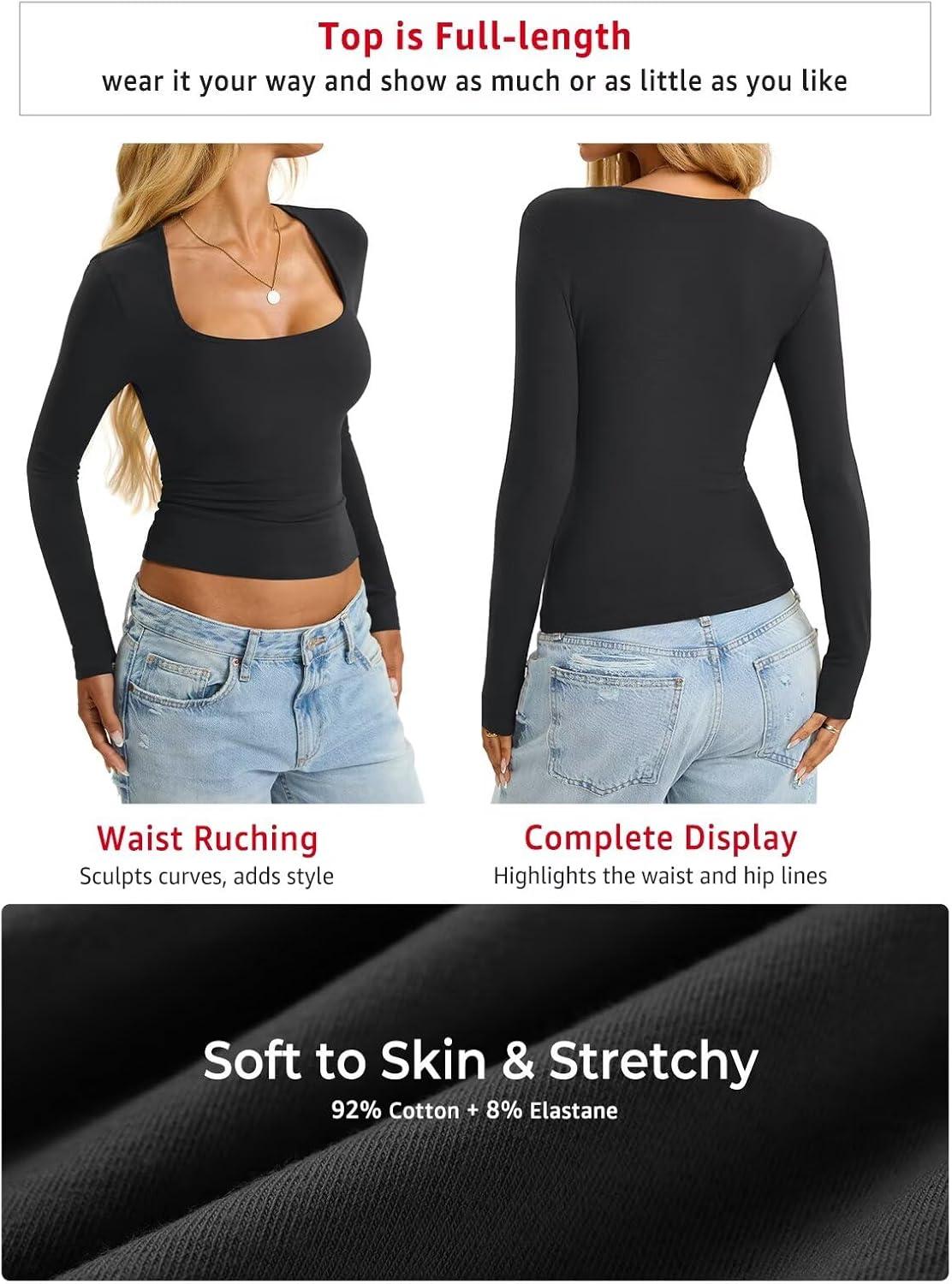 Womens Cotton Tops Long Sleeve T Shirts Square Neck Y2k Tops Slim Fit Going Out Fall Fashion Clothes 2025(Black)