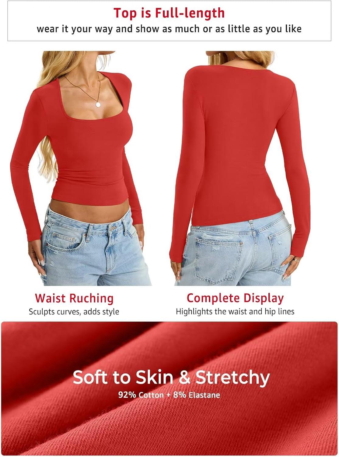 Womens Cotton Tops Long Sleeve T Shirts Square Neck Y2k Tops Slim Fit Going Out Fall Fashion Clothes 2025(Red)