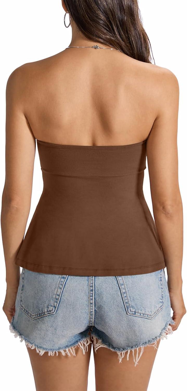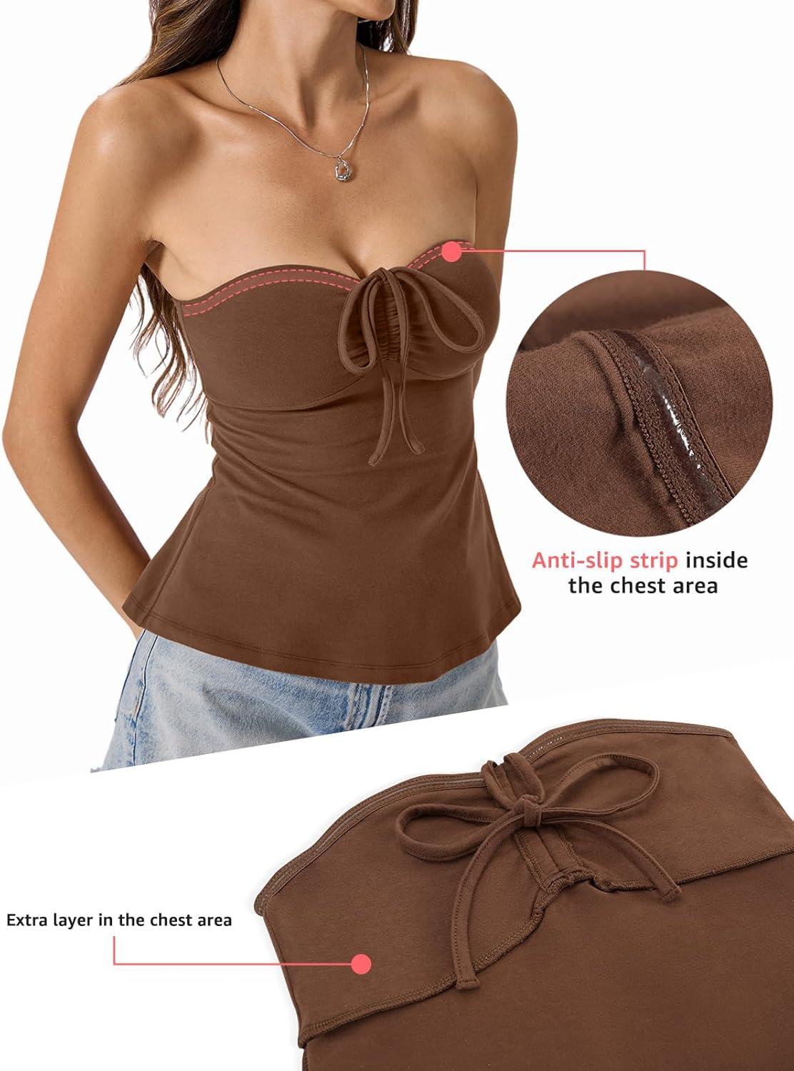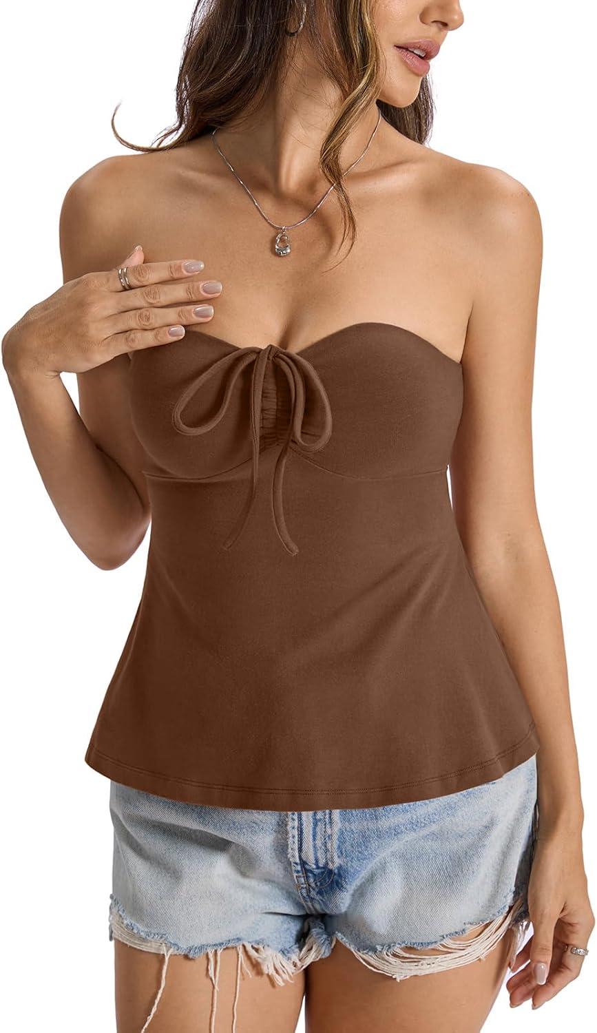 Womens Cotton Tube Tops Tie Front Ruched Strapless Tank Babydoll Peplum Bandeau Top Cute Crop Going Out Outfit(Brown)