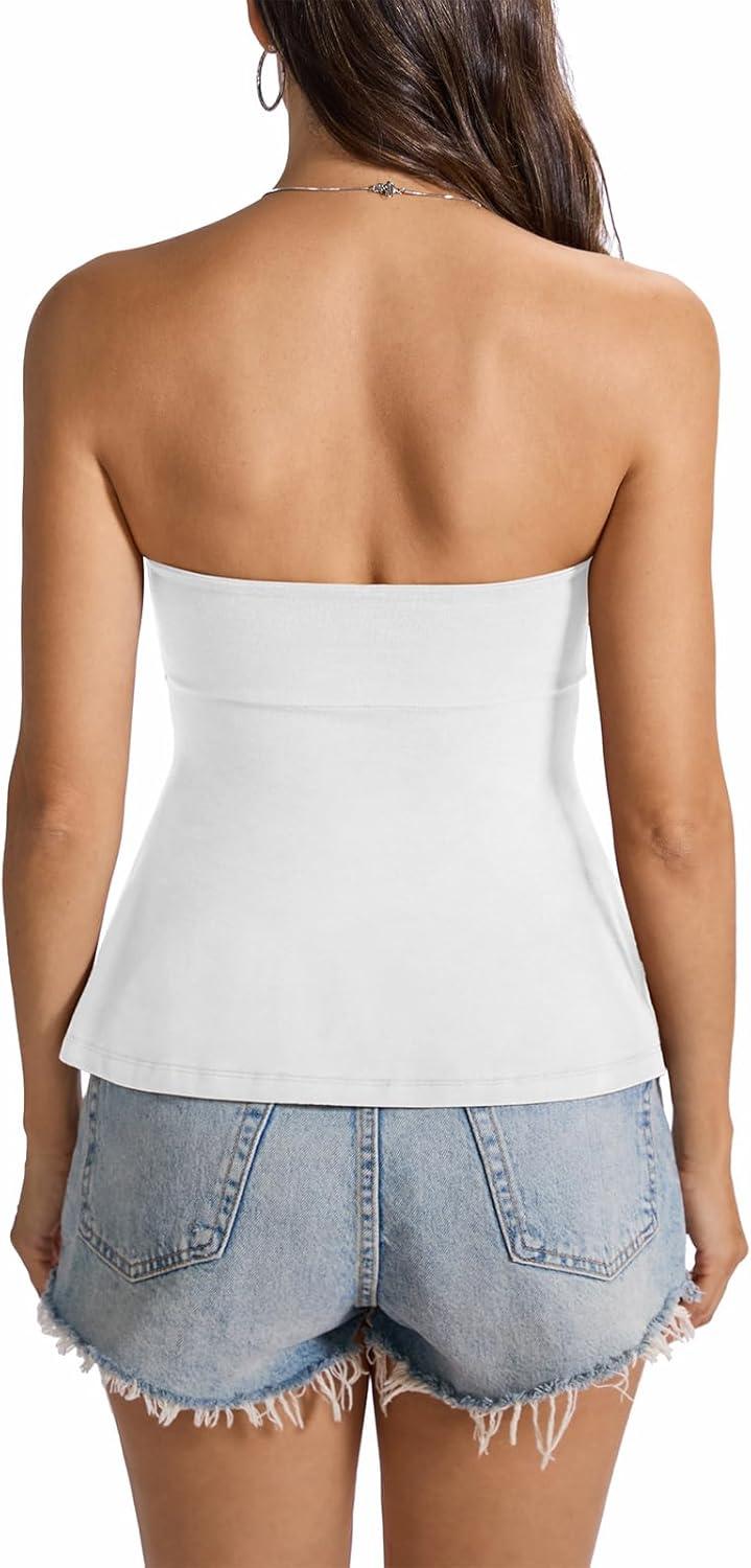Womens Cotton Tube Tops Tie Front Ruched Strapless Tank Babydoll Peplum Bandeau Top Cute Crop Going Out Outfit(True White)