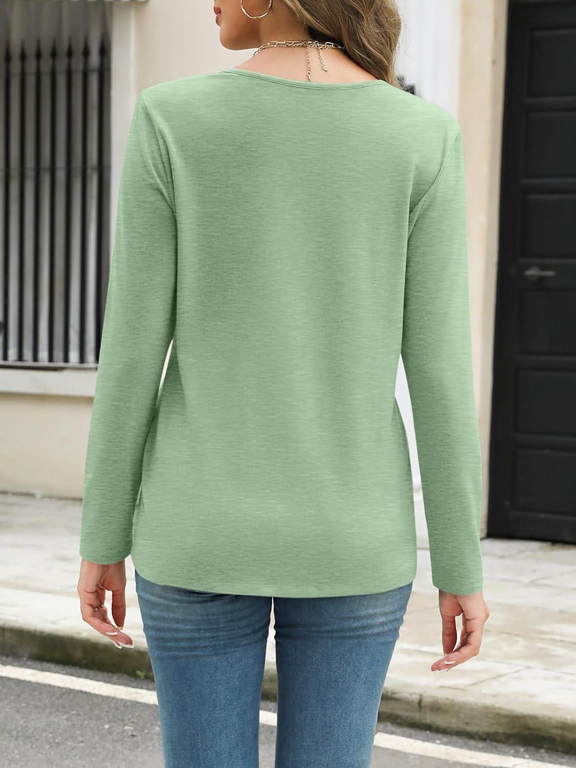 Womens Deep V Neck Long Sleeve Shirts Pleated Dressy Casual Tops Sexy Loose Fit T Shirt(Grass Green)