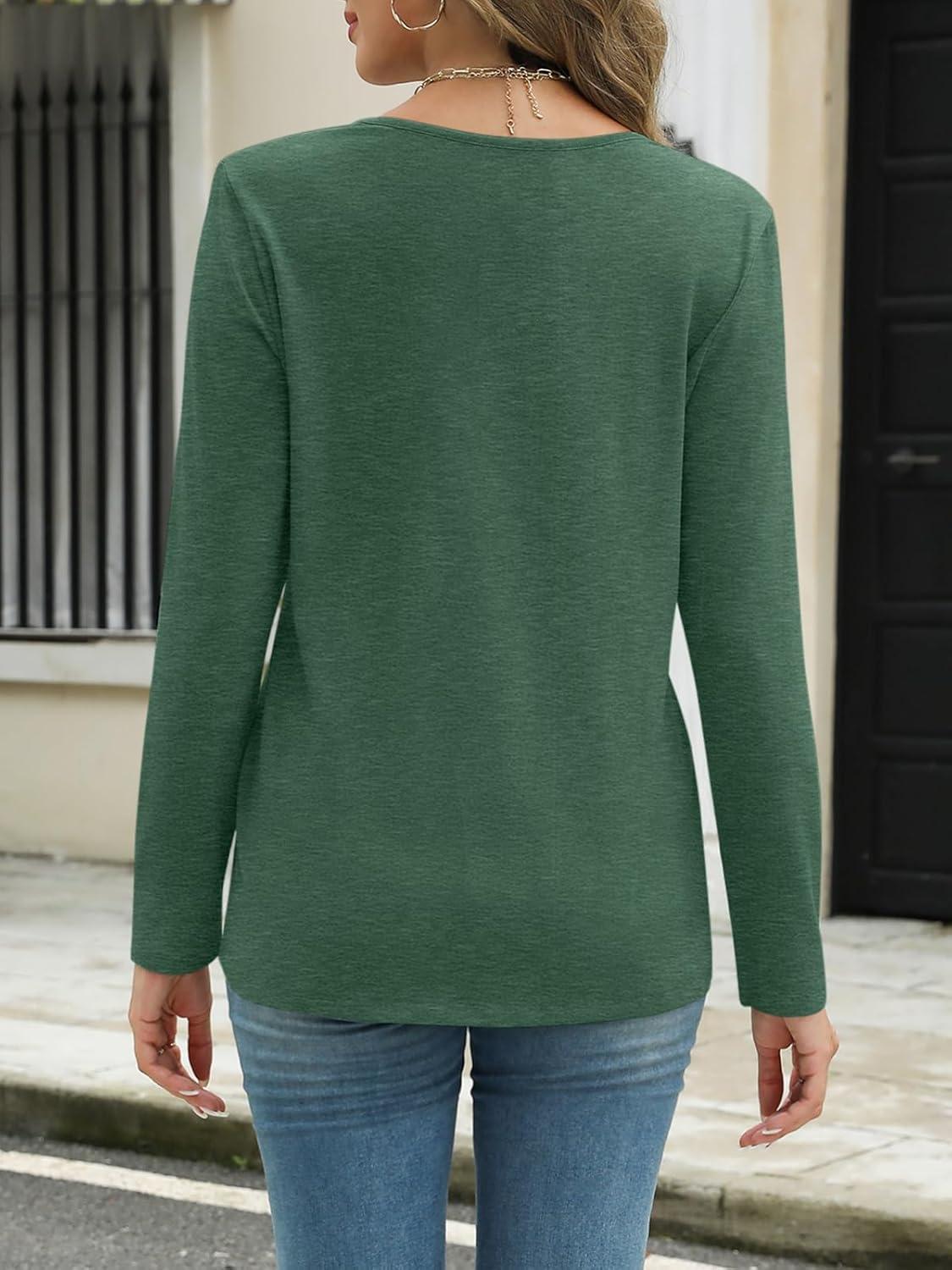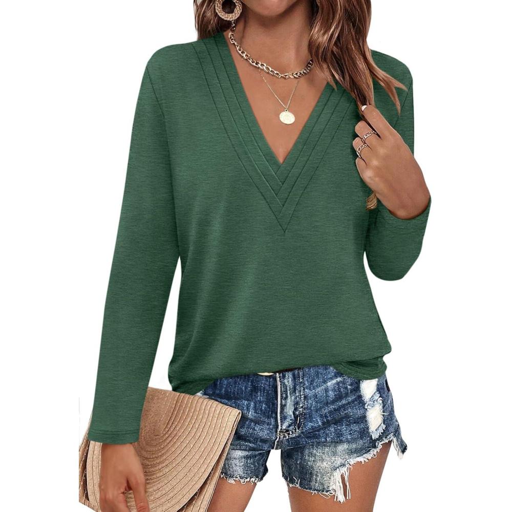 Womens Deep V Neck Long Sleeve Shirts Pleated Dressy Casual Tops Sexy Loose Fit T Shirt(Green)