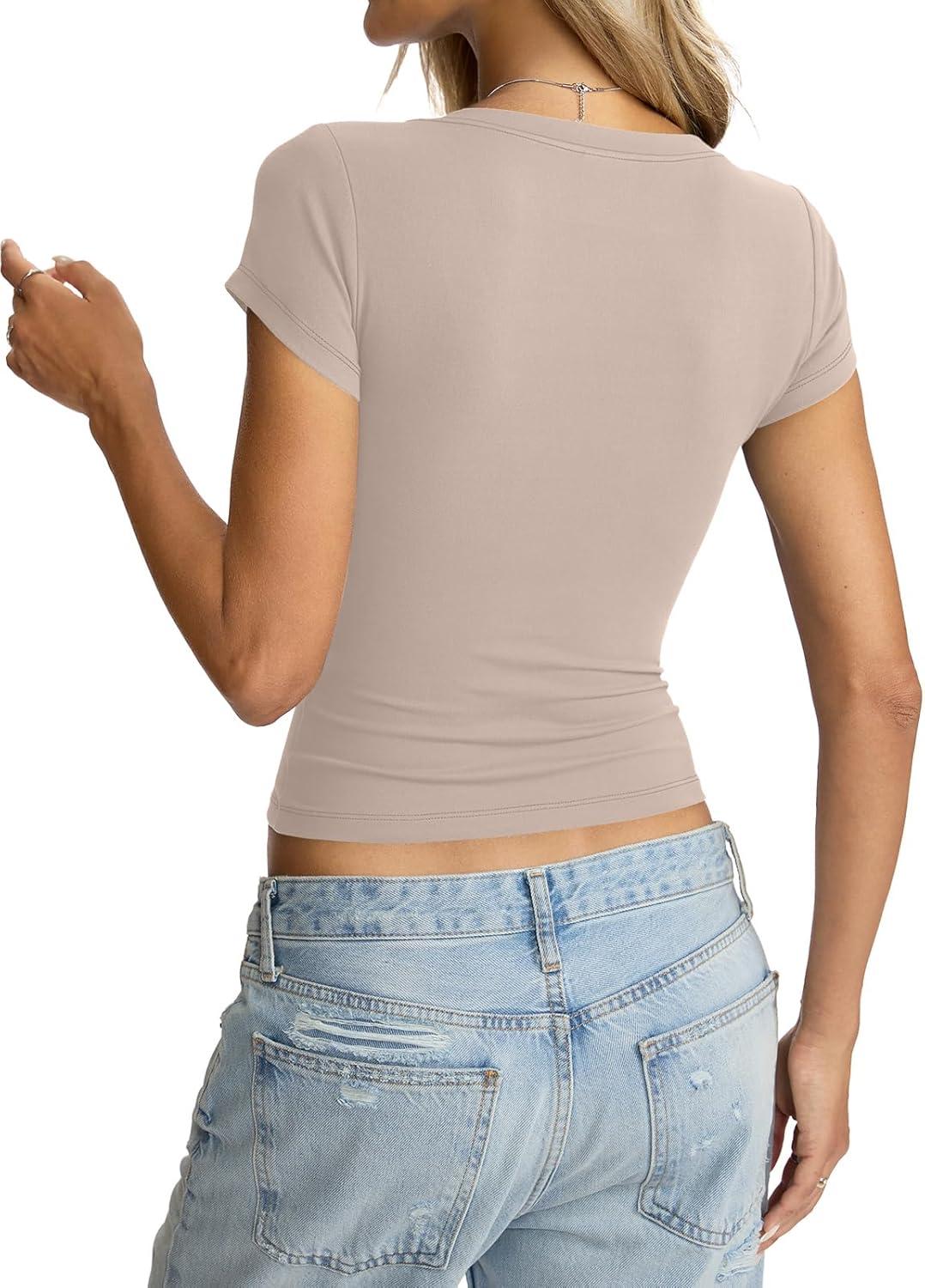 Womens Deep V Neck Short Sleeve Shirts Sexy Slim Fit Crop Tops Basic Tees Going Out Summer Outfits(Light Coffee)