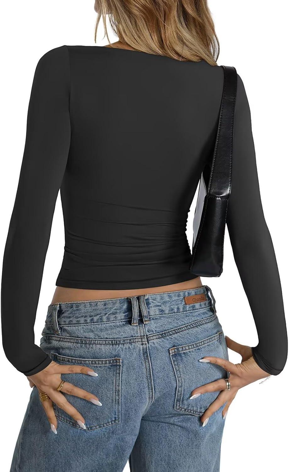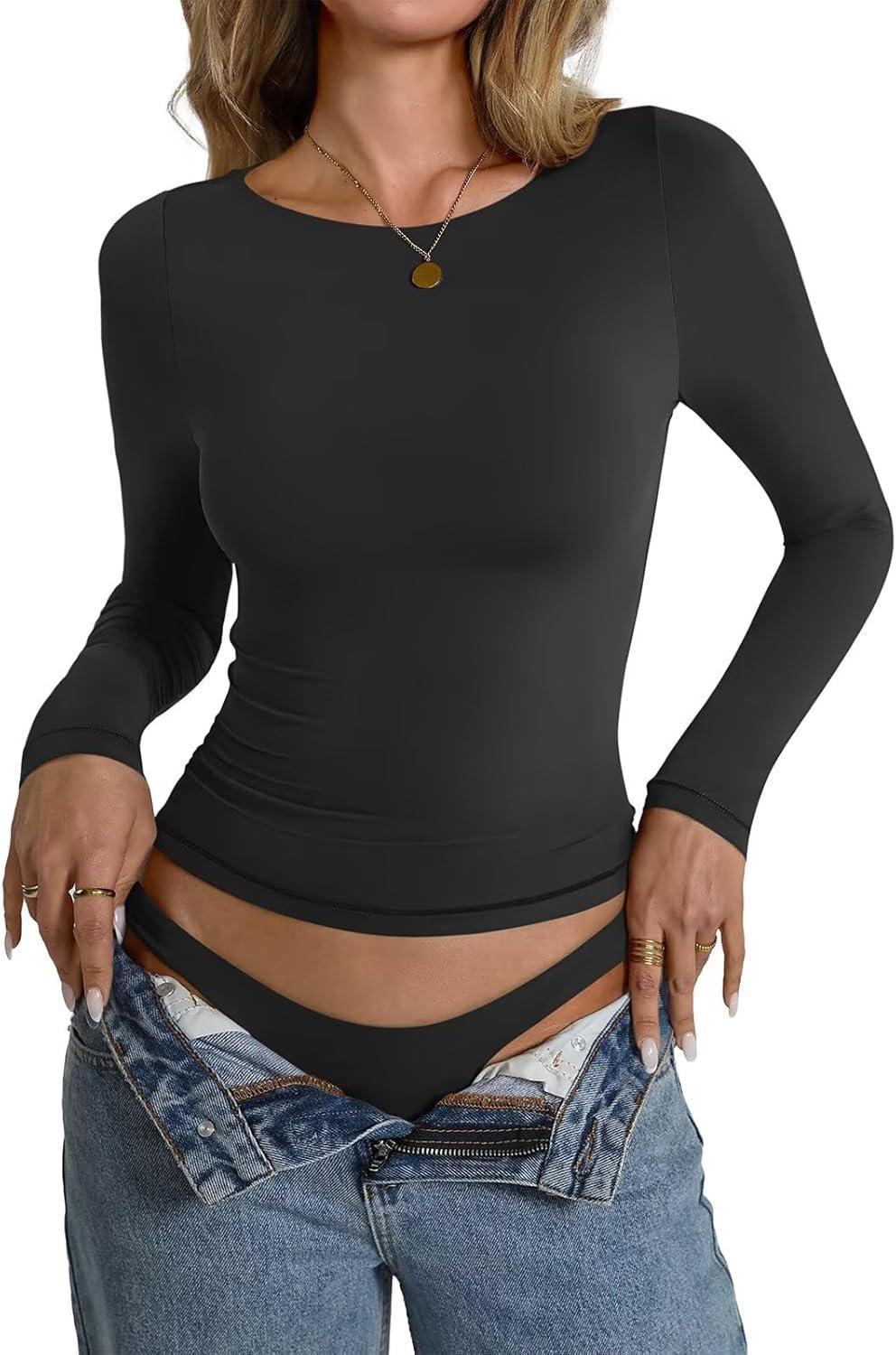Womens Double Lined Long Sleeve Shirts Boat Neck Going Out Tops Trendy Slim Fitted Tees Basic Fall Outfits 2025(Black)