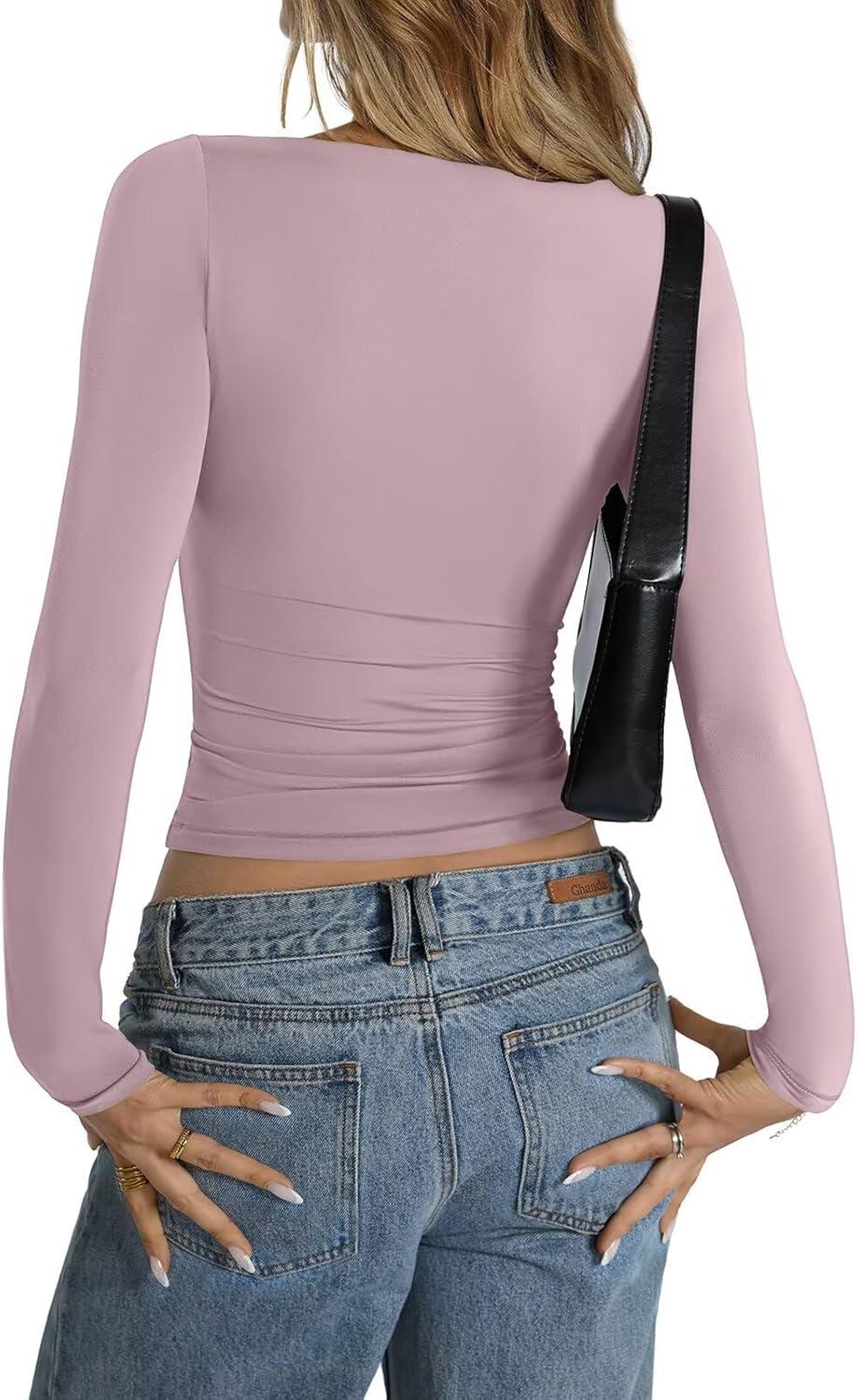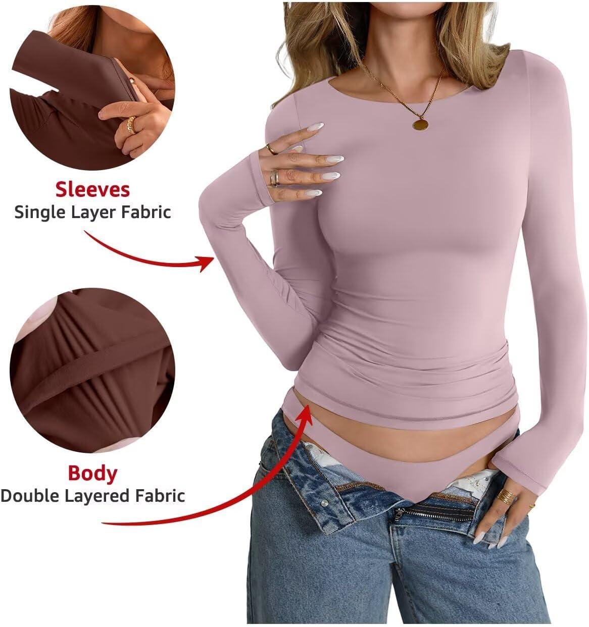 Womens Double Lined Long Sleeve Shirts Boat Neck Going Out Tops Trendy Slim Fitted Tees Basic Fall Outfits 2025(Chalk Pink)