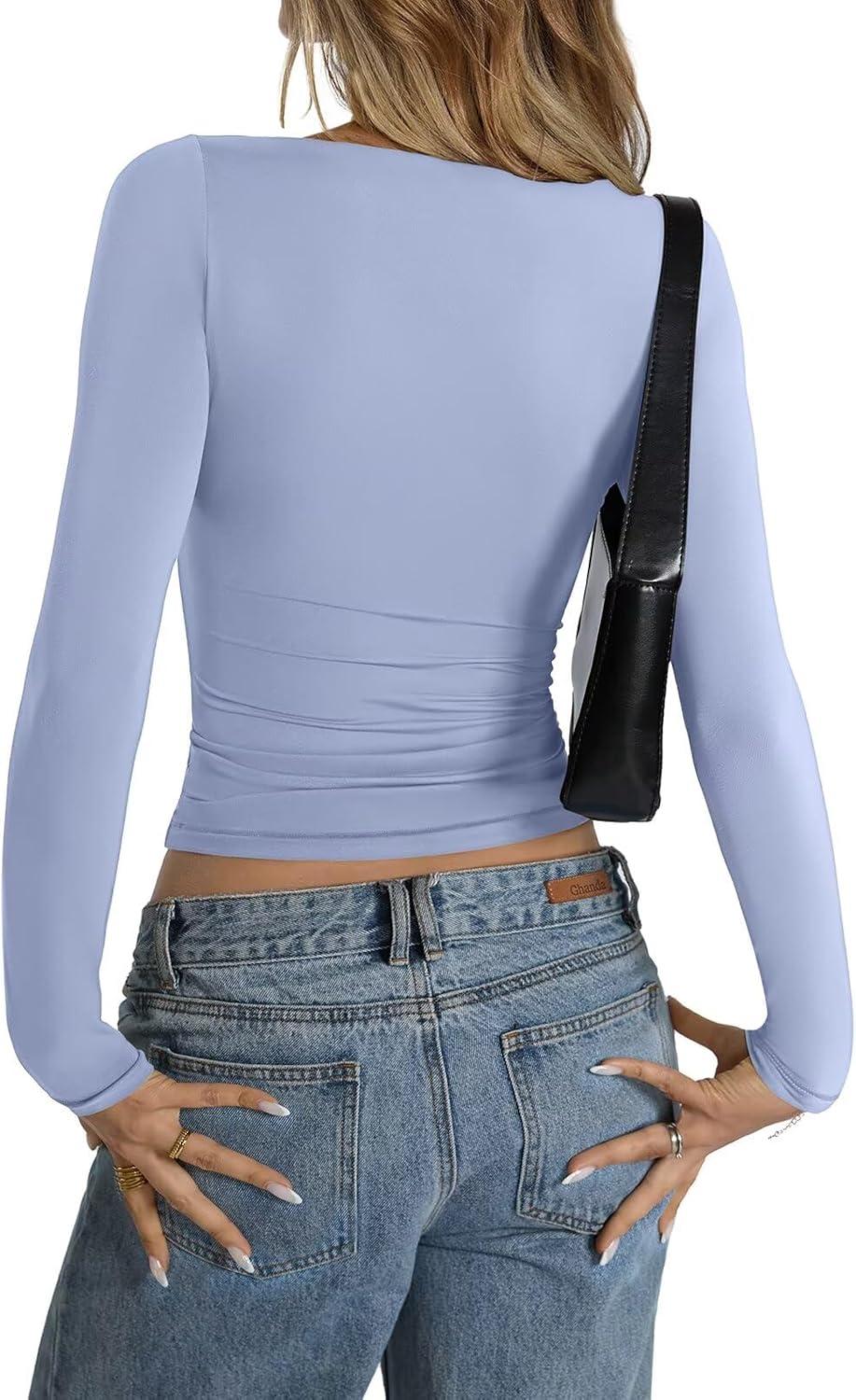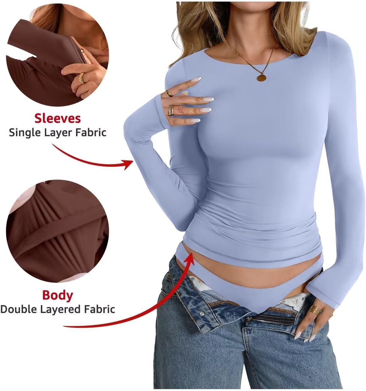 Womens Double Lined Long Sleeve Shirts Boat Neck Going Out Tops Trendy Slim Fitted Tees Basic Fall Outfits 2025(Light Blue)