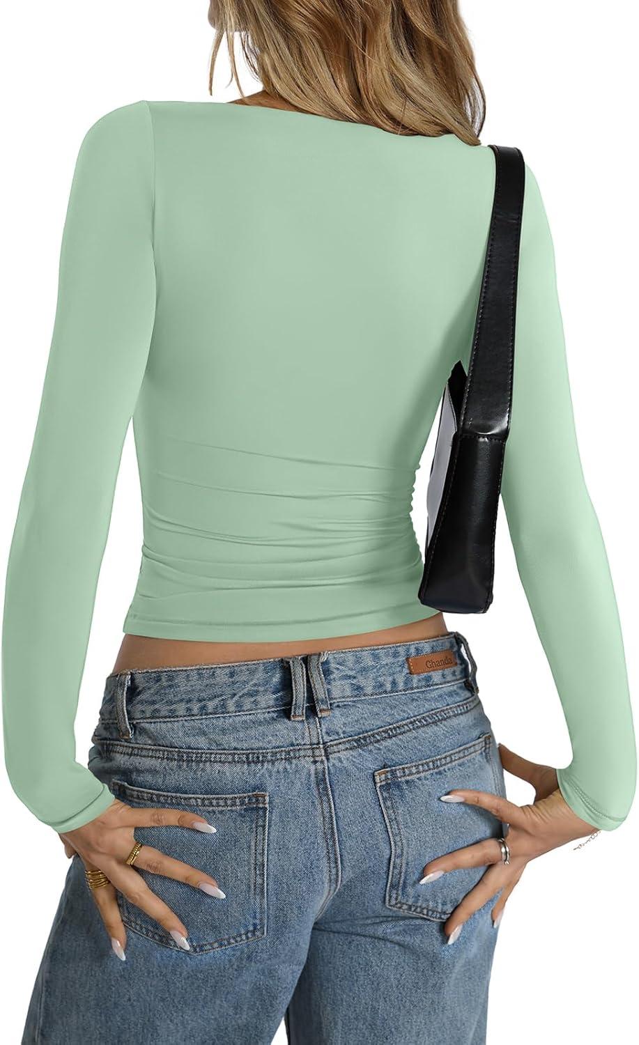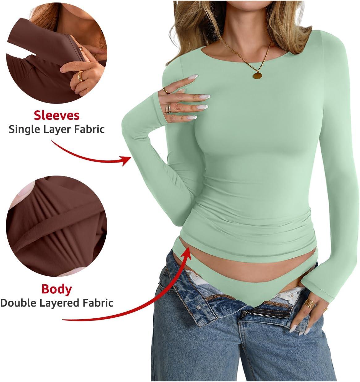 Womens Double Lined Long Sleeve Shirts Boat Neck Going Out Tops Trendy Slim Fitted Tees Basic Fall Outfits 2025(Smoke Green)