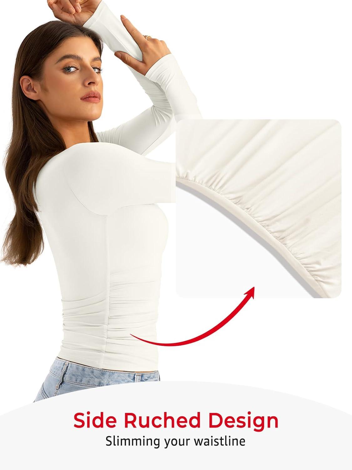 Womens Double Lined Long Sleeve Shirts Crewneck Ruched Top Tight Fitted Basic Tee Fall Going Out Outfits 2026(Cream White)