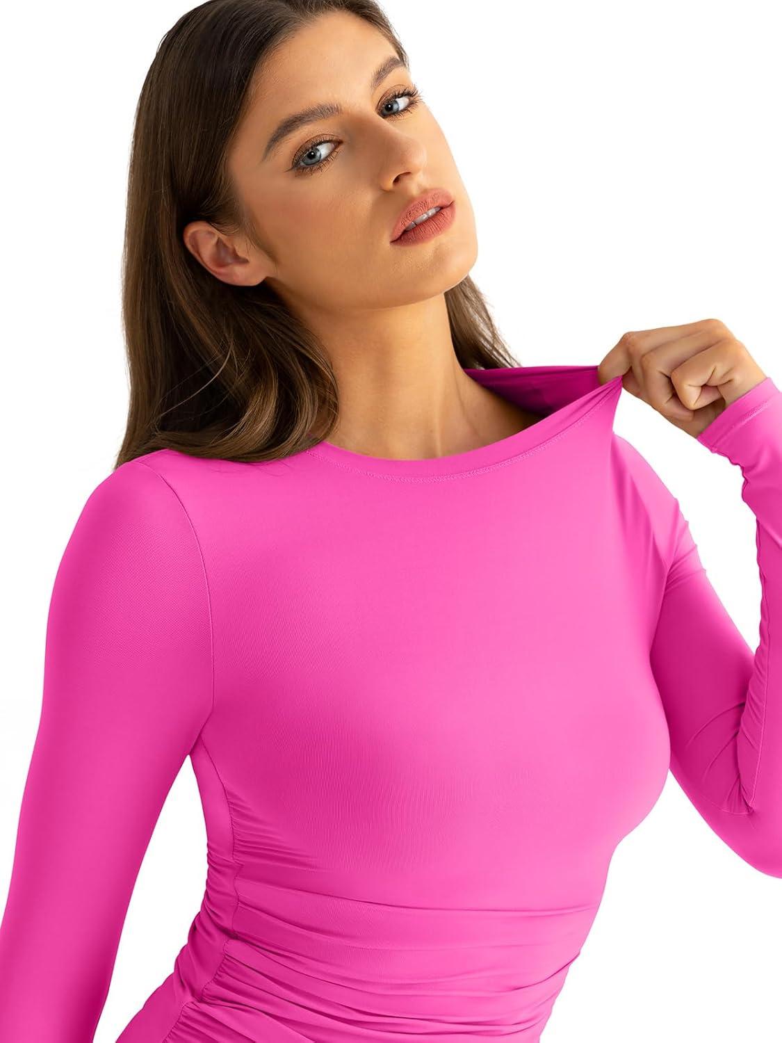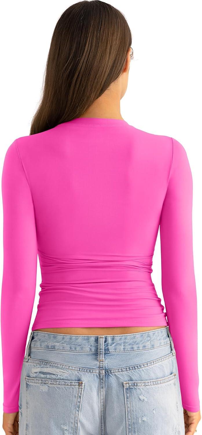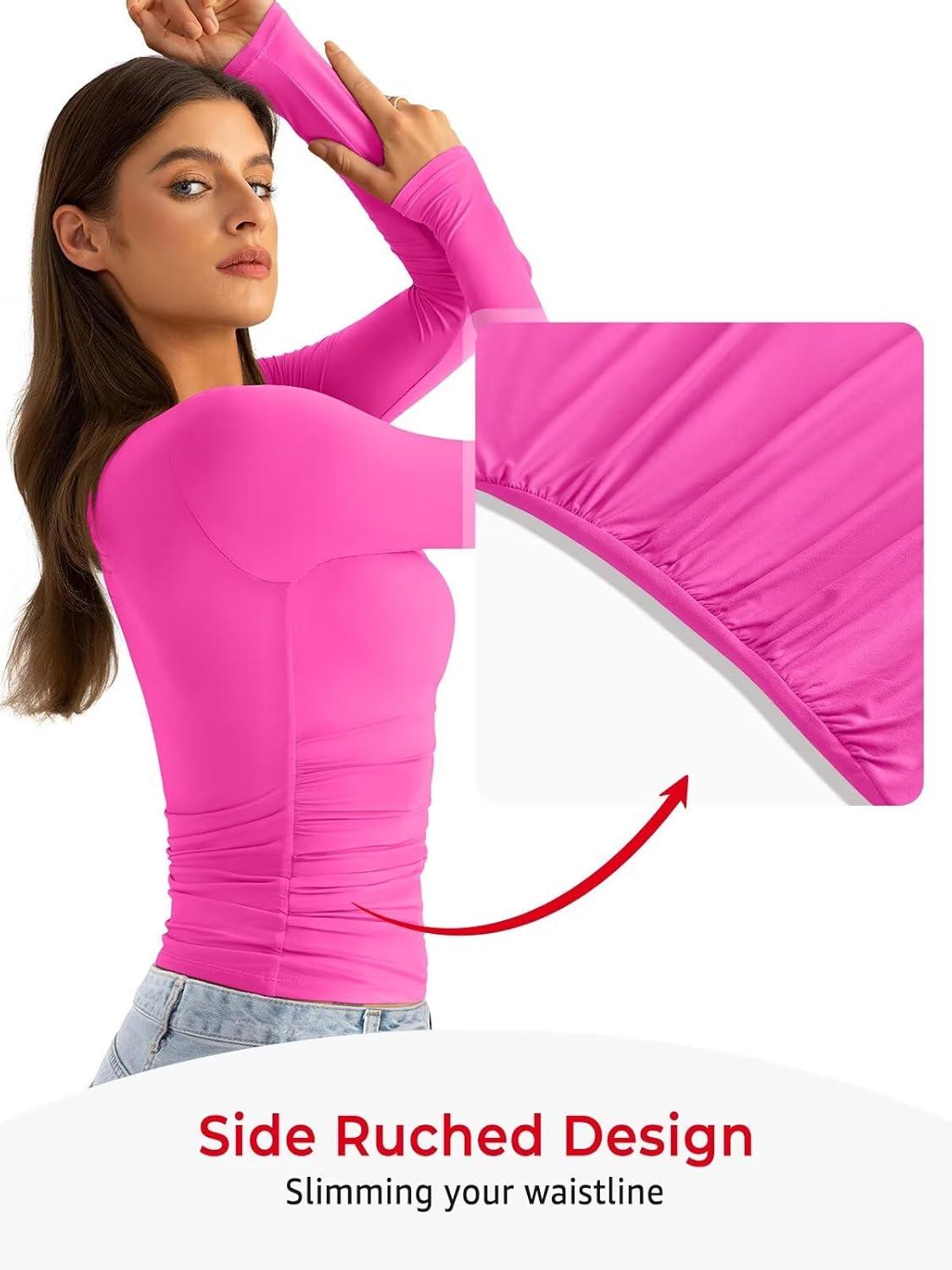 Womens Double Lined Long Sleeve Shirts Crewneck Ruched Top Tight Fitted Basic Tee Fall Going Out Outfits 2026(Hot Pink)