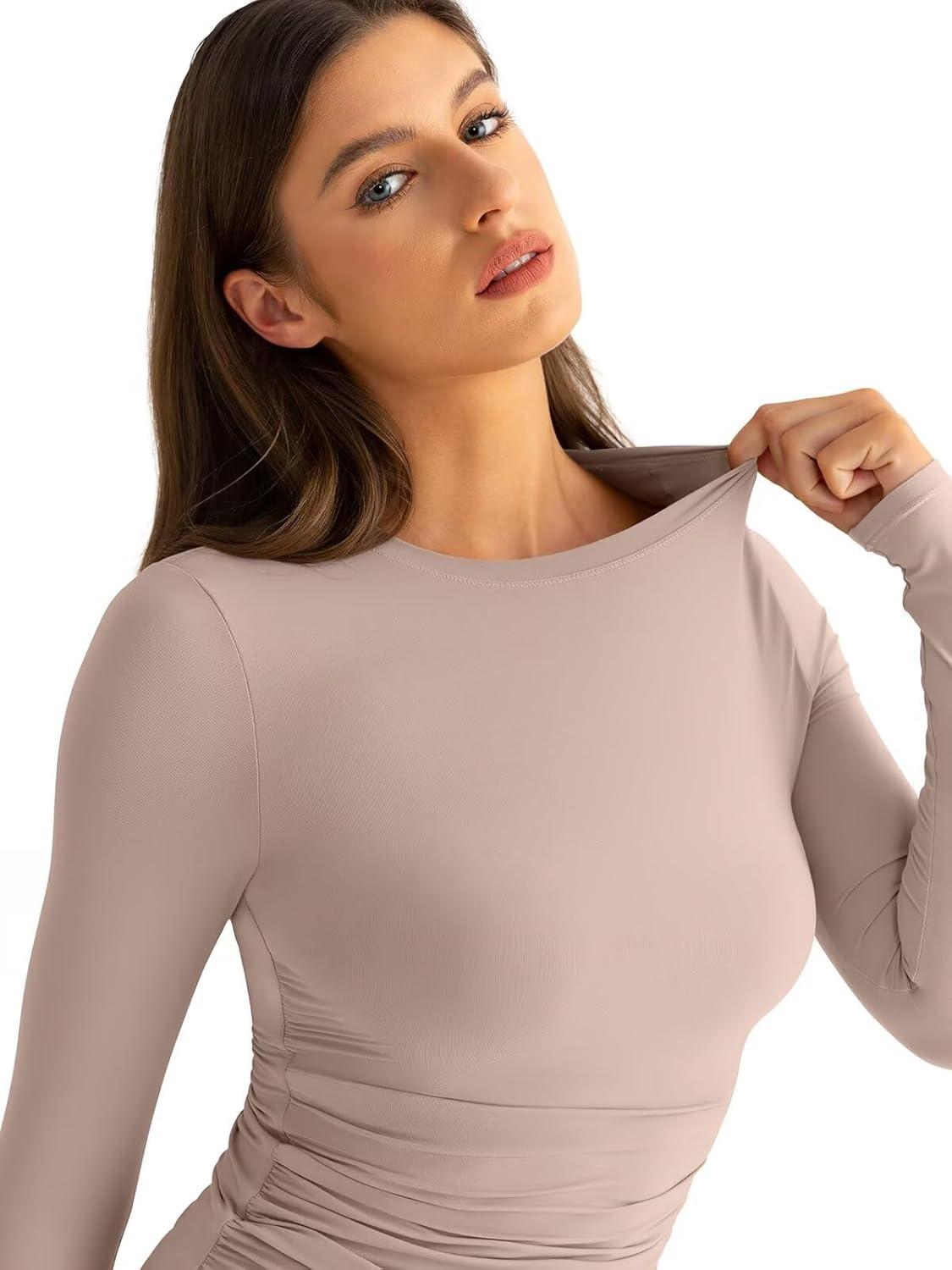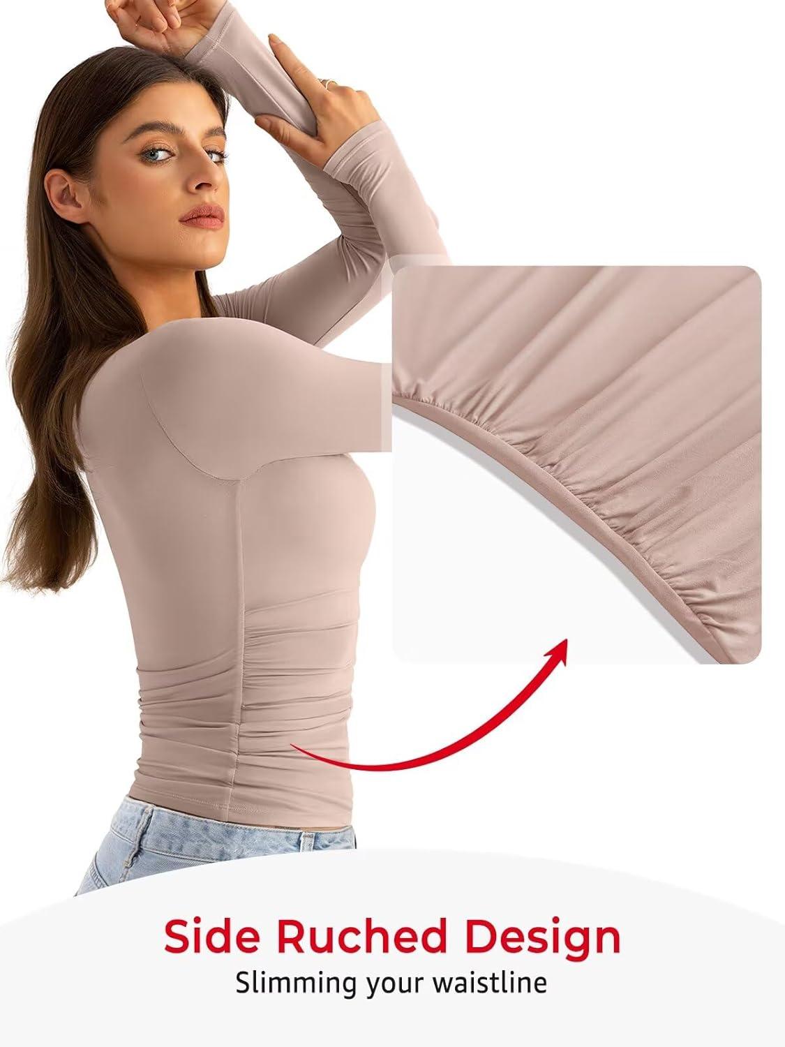 Womens Double Lined Long Sleeve Shirts Crewneck Ruched Top Tight Fitted Basic Tee Fall Going Out Outfits 2026(Taupe Gray)