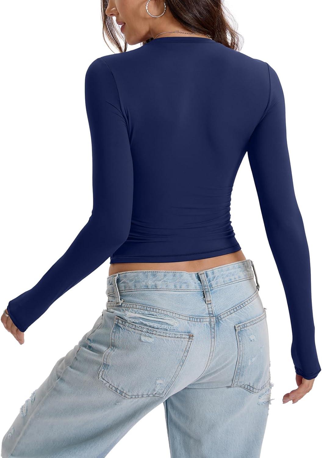 Womens Double Lined Long Sleeve Tops Crew Neck Fitted Basic T Shirts Crop Going Out Tops 2026(Navy Blue)