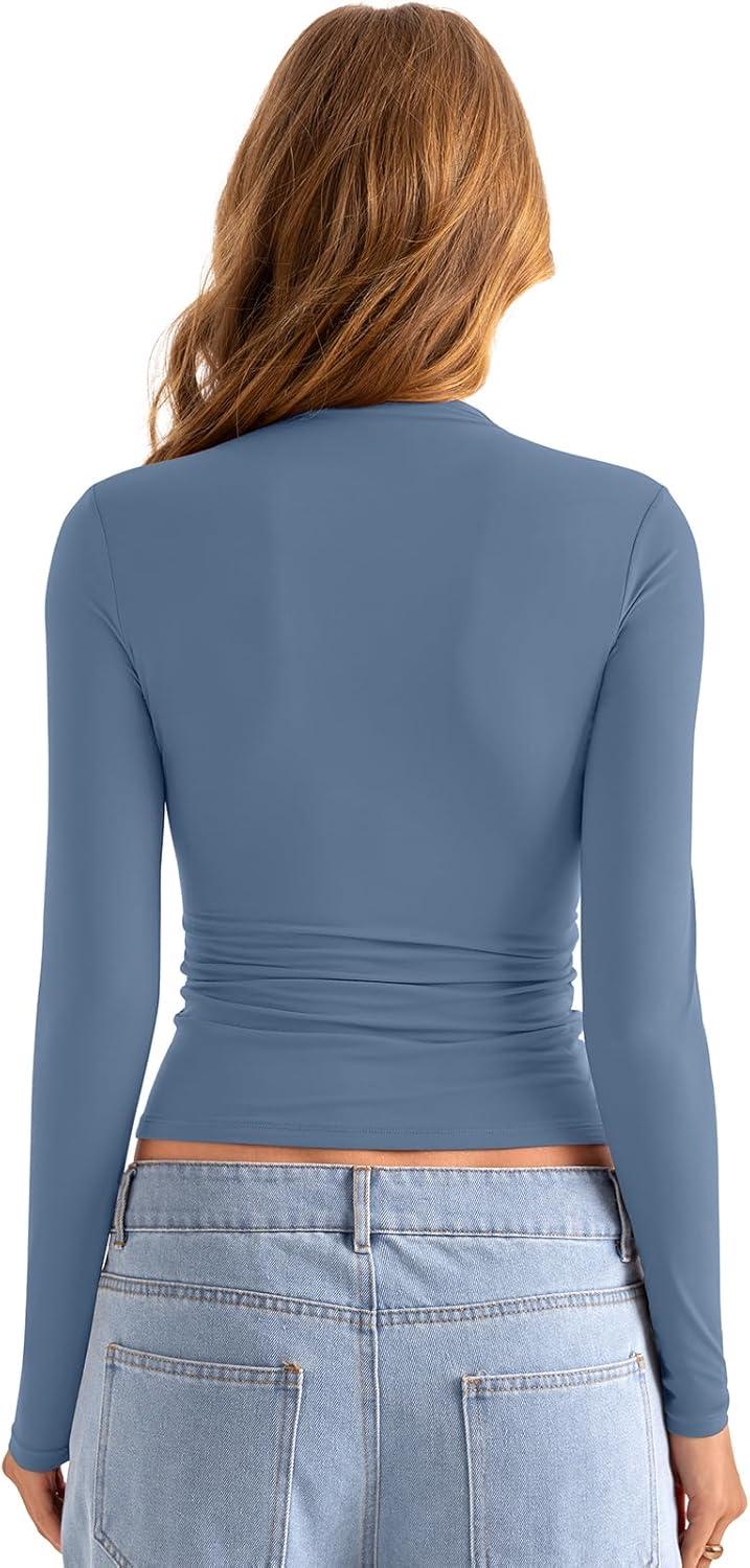 Womens Double Lined Mock Turtle Neck Long Sleeve Tops Slim Fitted Going Out Tops Basic T Shirts(Dusty Blue)